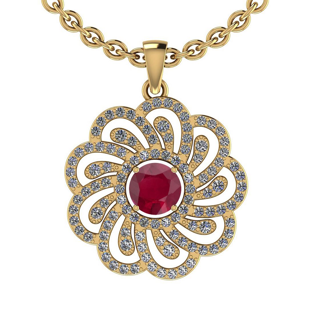 Certified 1.19 Ctw SI2/I1 Ruby And Diamond 14K Yellow G **|**|** Center Stone Approx Weight: 0.60 Ctw (Round Cut) Center Stone Color: Ruby Center Stone Setting: Prong Side Stone 0.59 Ctw Side Stone Color: J-K Stone Clarity: SI2/I1 Stone Setting: Prong Metal Approx Weight: 3.80 Gram 14K Yellow Gold Vintage Style Necklace Made In USA