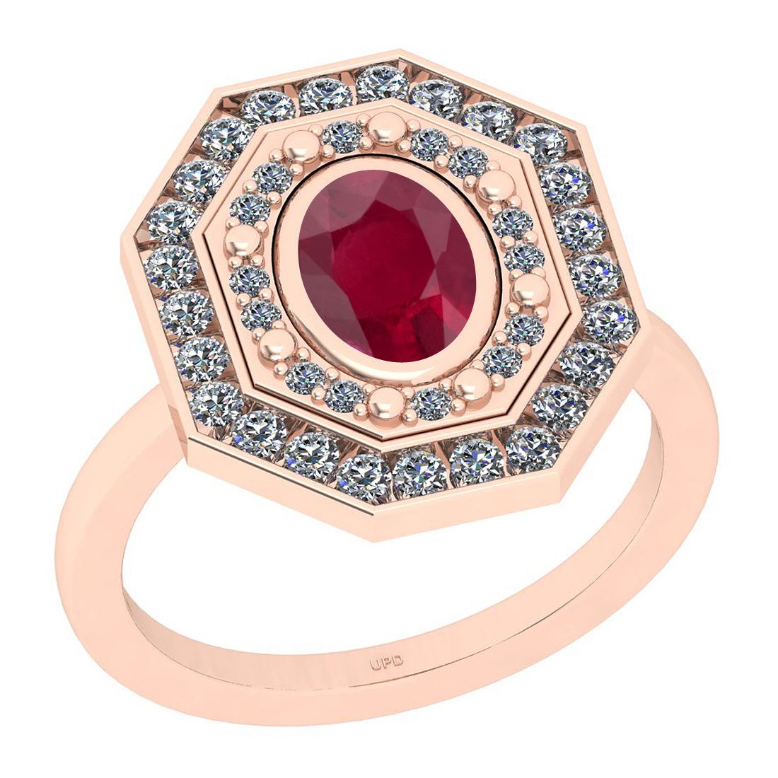 Certified 1.30 Ctw I2/I3 Ruby And Diamond 14K Rose Gold **|**|** Center Stone Approx Weight: 0.75 Ctw (Oval Cut) Center Stone Color: Ruby Center Stone Setting: Prong Side Stone 0.55 Ctw Side Stone Color: J-K Stone Clarity : I2/I3 Stone Setting: Prong Metal Approx Weight: 4.00 Gram 14K Rose Gold Engagement Halo Ring Size: 6 (Free Sizing Avail)