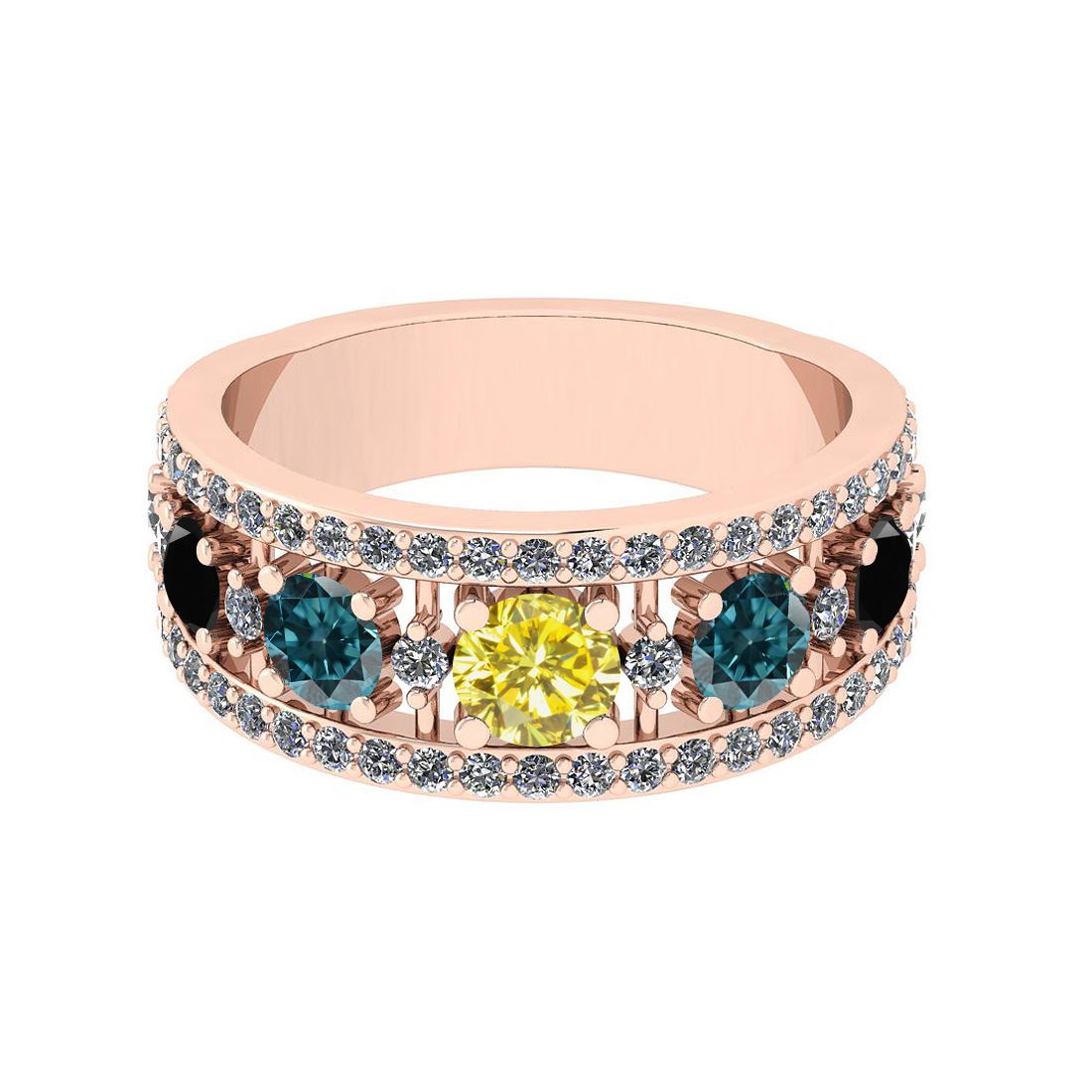 Certified 1.67 Ctw I2/I3 Multi Treated Fancy Blue,Black **|**|** Multi Diamond Approx Weight: 1.07 Ctw (Round Cut) Multi Diamond Color: Treated Fancy Blue,Black,Yellow Stone Setting: Prong Side Stone 0.60 Ctw Side Stone Color: J-K Stone Clarity: I2/I3 Stone Setting: Prong Metal Approx Weight: 6.40 Gram 14K Rose Gold Wedding Band Ring Size: 6 (Free Sizing Avialable 4.5 - 9)