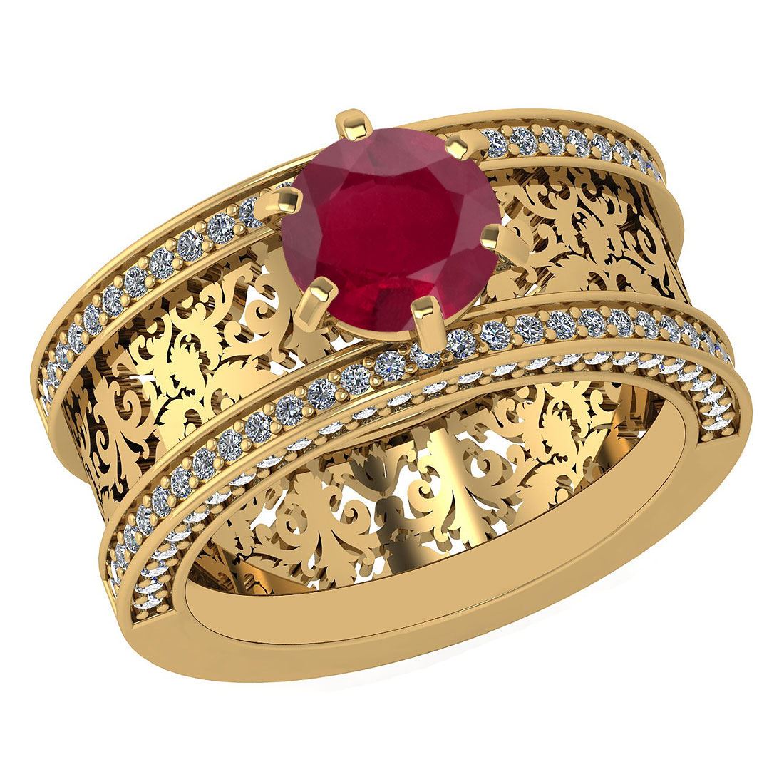 Certified 1.81 Ctw Ruby And Diamond Wedding/Engagement **|**|** Stone Weight ; 1.25 Ctw (1 Pcs Round) Stone Color :Ruby Center Stone Setting ; Prong Side Stone (1.mm 112 Pcs Round Cut Diamond)0.56 ctw Side Stone Color: White G-H Diamond Side Stone Setting: Prong Side Stone Clarity : VS/SI1 Metal Color: Yellow Gold Metal Weight : Approx 6.00 Gram 14K Yellow Gold Wedding/Engagement Halo Ring