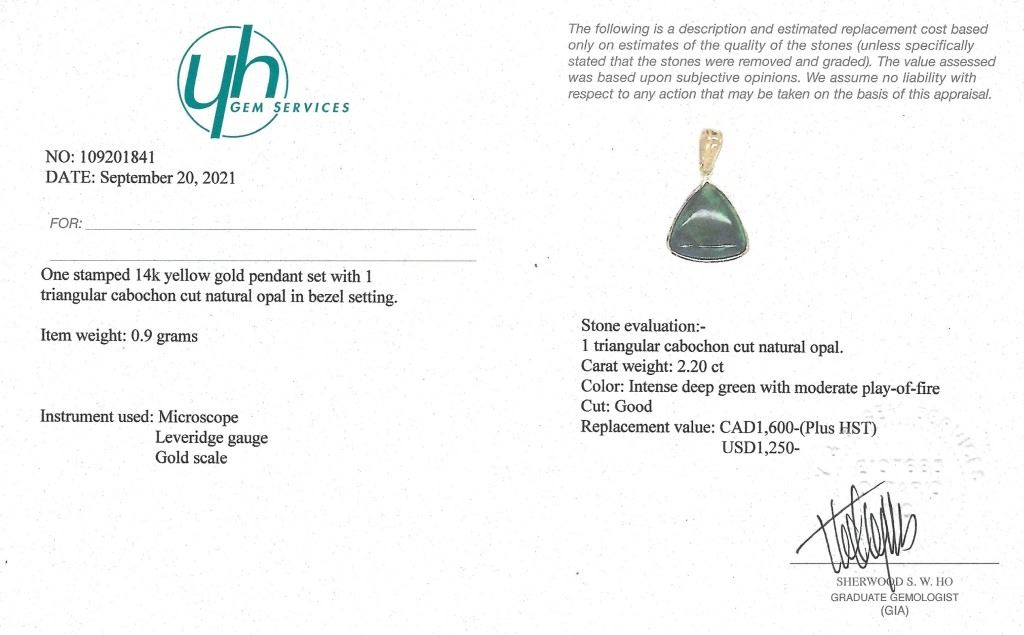 14K Yellow Gold Triangular Cabochon Cut Opal(2.2ct) Pendant (~weight 0.9g), Suggested Retail Value:550