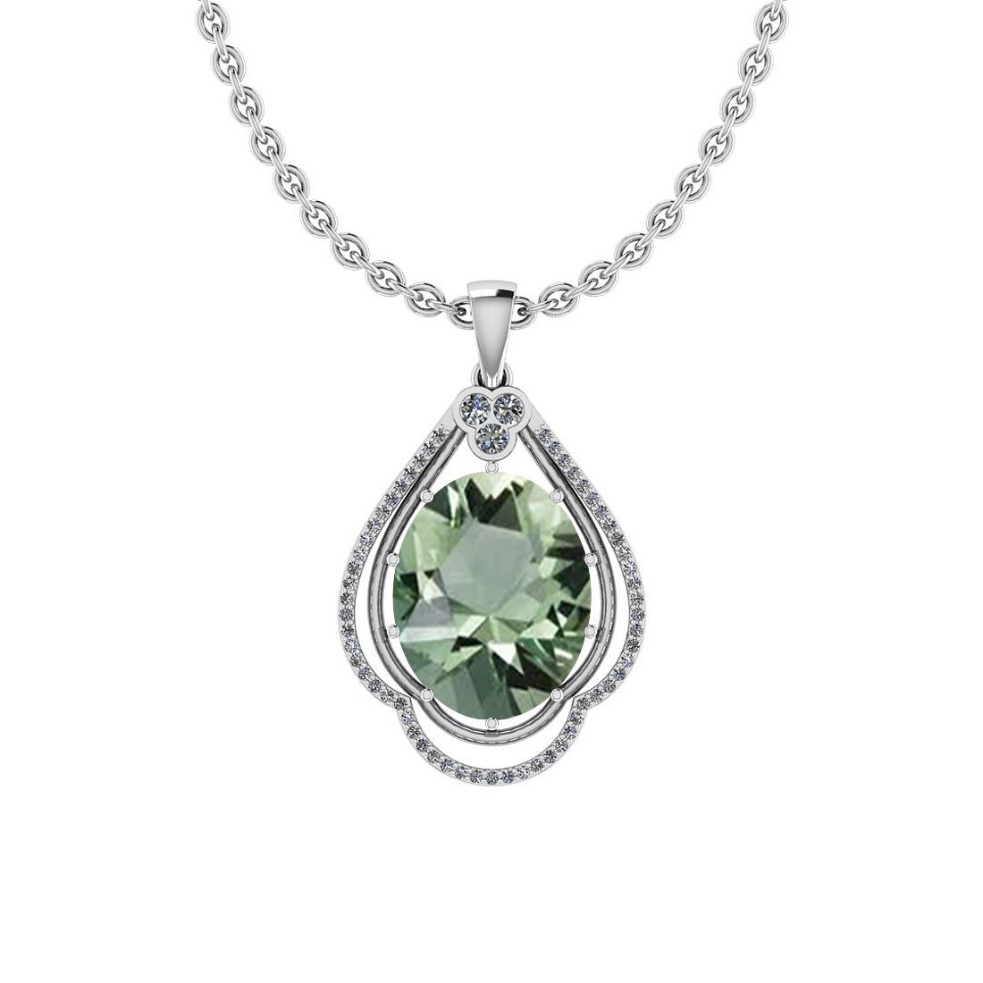 Certified 15.16 Ctw I2/I3 Green Amethyst And Diamond 10 **|**|** Center Stone Approx Weight: 14.78 Ctw (Oval Cut) Center Stone Color: Green Amethyst Center Stone Setting: Prong Side Stone 0.38 Ctw Side Stone Color: J-K Stone Clarity: I2/I3 Stone Setting: Prong Metal Approx Weight: 4.00 Gram 10K White Gold Pendant