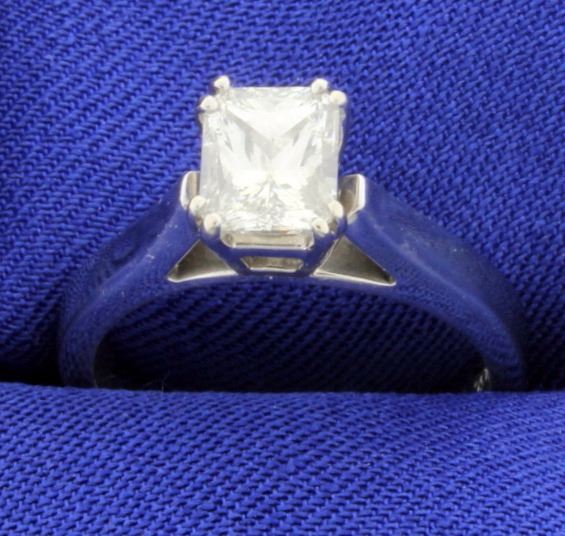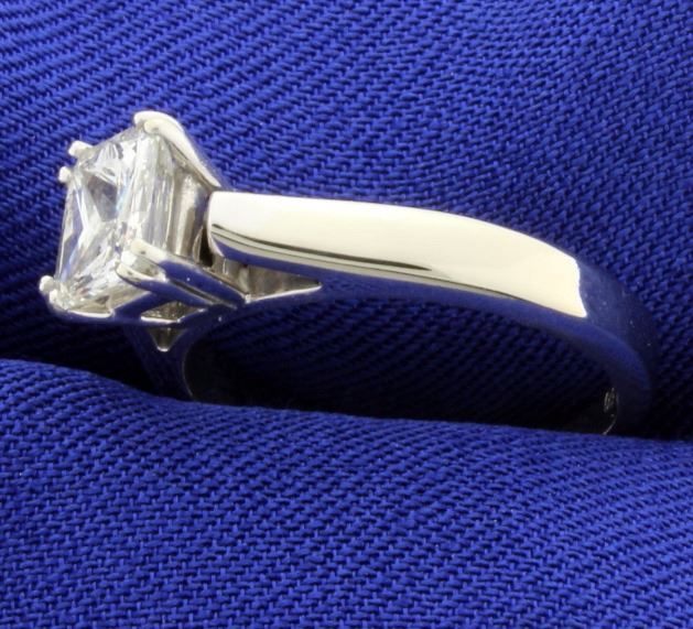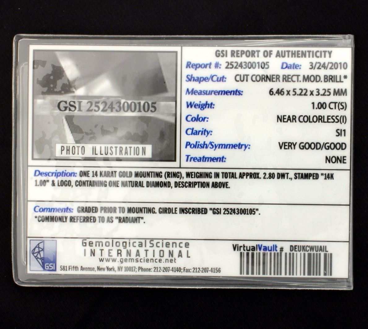 In 14K white gold, it contains a certified 1ct, SI1 clarity/I color radiant cut diamonds. Size 5 3/4 4.1g