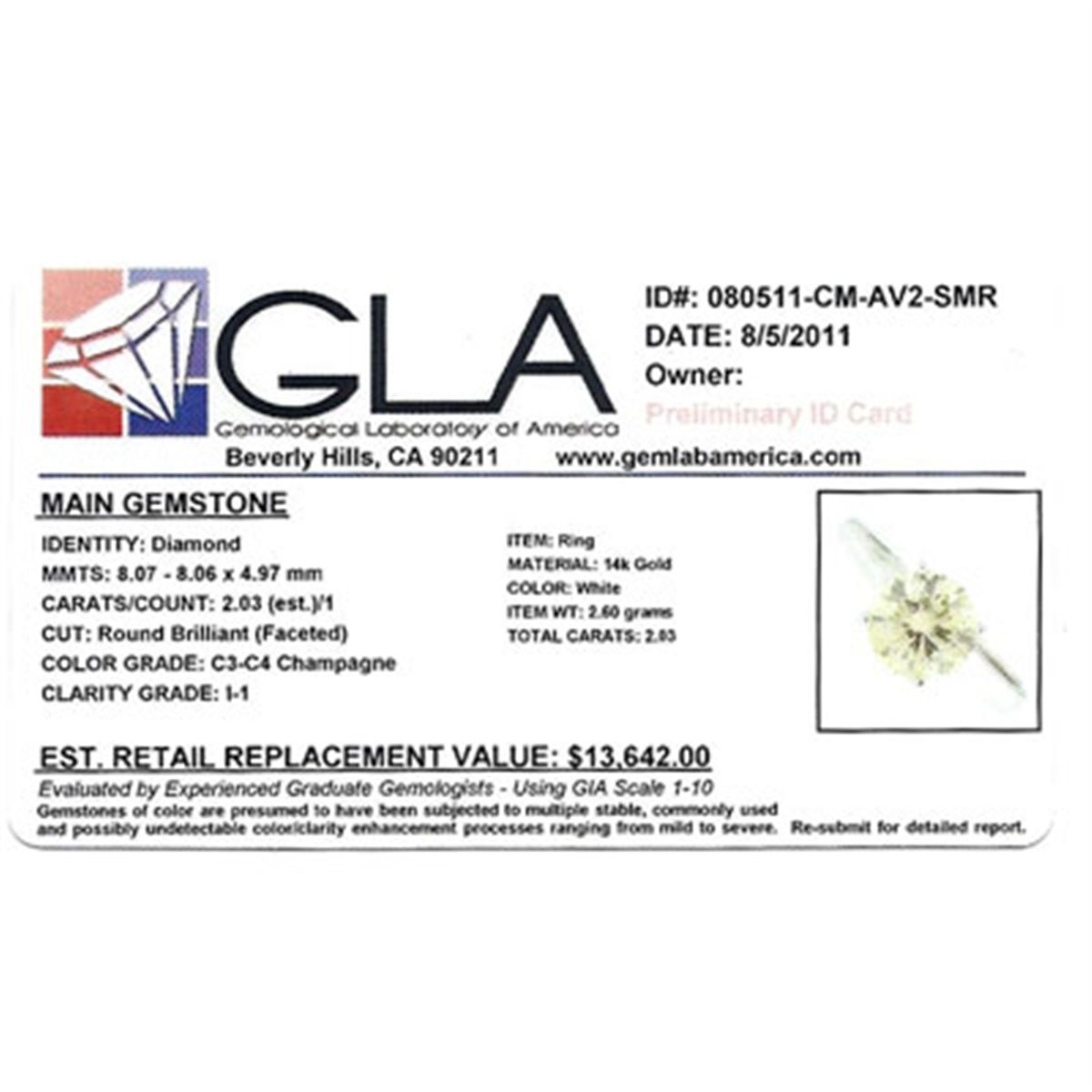 Diamond CTW: 2.03 ; Purity: 14kt ; Metal: White Gold ; Diamond Count: 1 Round Cut ; Clarity: I1 ; Color: ; Approx Weight(g): 2.6 ; MSRP: $13642