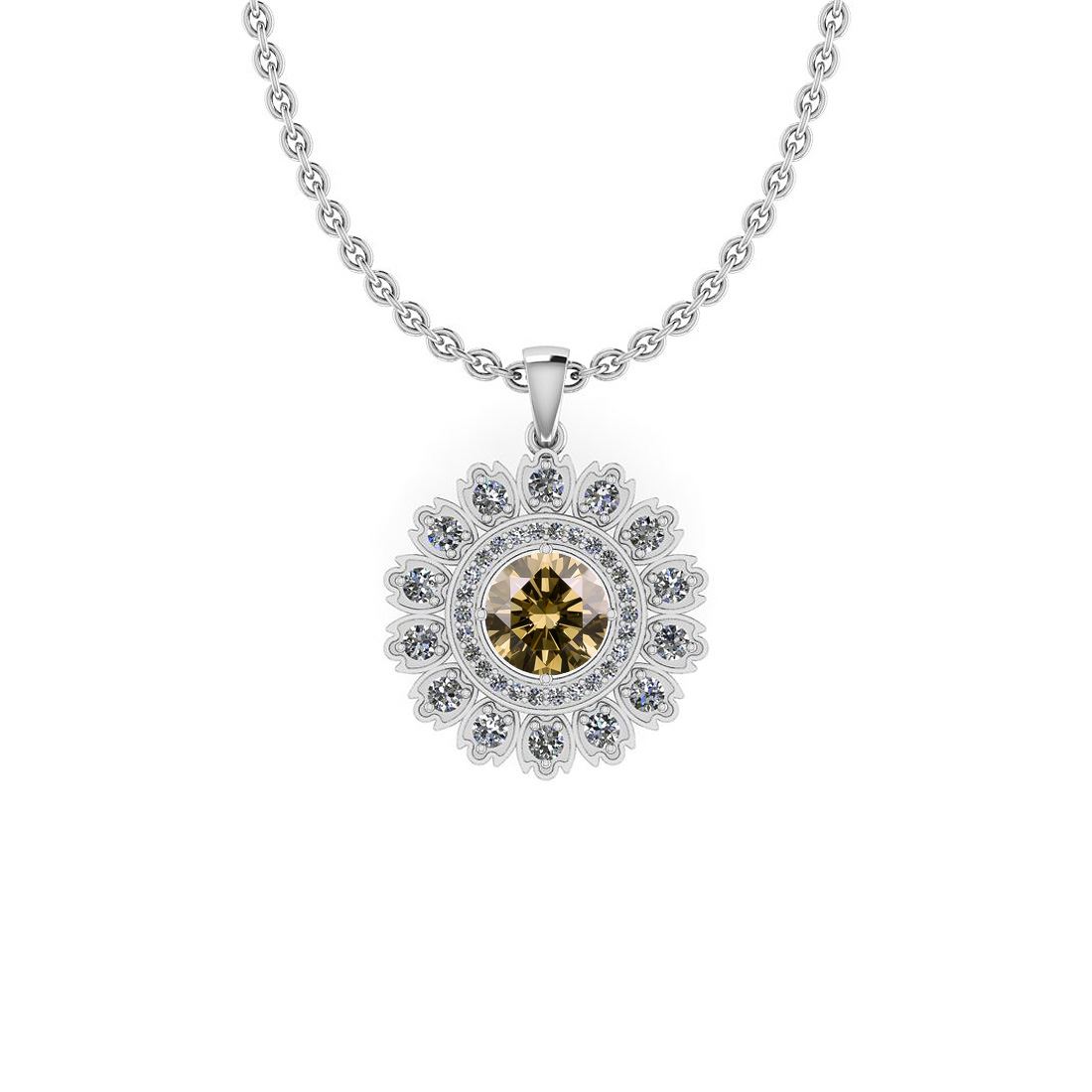 Certified 2.16 Ctw VS/SI1 Natural Fancy Yellow Brown An **|**|** Center Weight : 1.51 Ctw (Round Cut ) Center Color: Natural Fancy Yellow Brown Diamond Center Setting: Prong Side Stone 0.65 Ctw Side Stone Color: J-K Stone Clarity: VS/SI1 Stone Setting: Prong Metal Approx Weight: 2.10 Gram 14K White Gold Halo Necklace