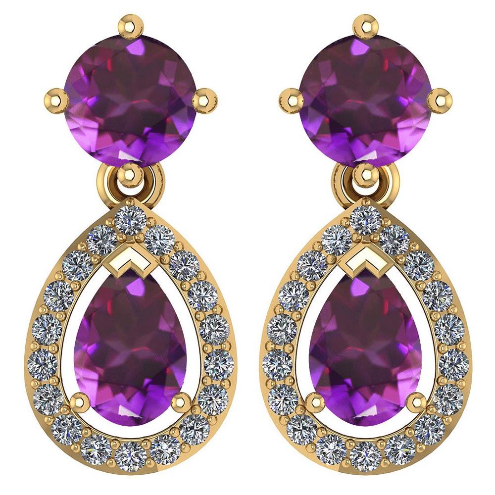 Certified 2.19 CTW Amethyst And Diamond 14k Yellow Gold **|**|** Center Stone Weight ; 1.00 CTW (2 Psc Pear) Top Stone Weight : 0.90 (2 Pcs Round) Center Stone Color : Amethyst Center Stone Setting ; Prong Side Stone (1.2mm 36Pcs Round Cut Diamond) 0.29 CTW Side Stone Color : White G-H Diamond Side Stone Setting: Prong Side Stone Clarity : VS/SI1 Metal Color Yellow Gold Metal Weight : Approx 2.72 Gram 14K Yellow Gold Halo Dangling Earring