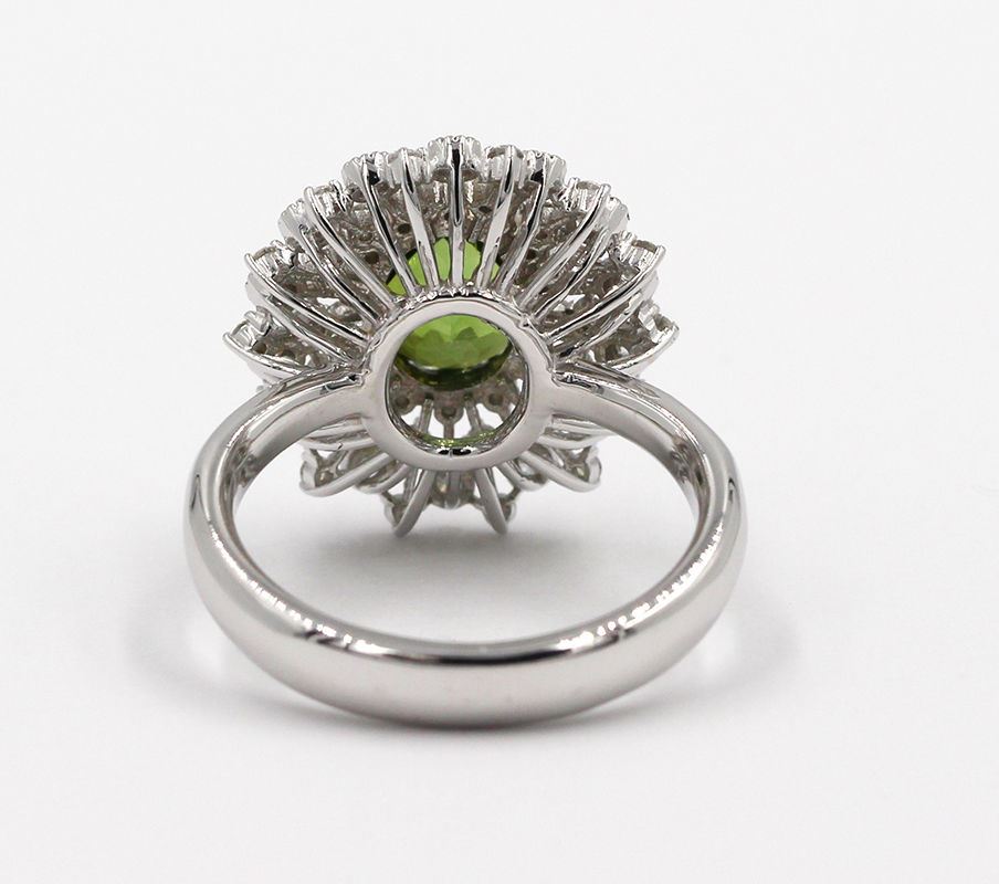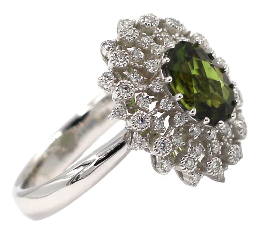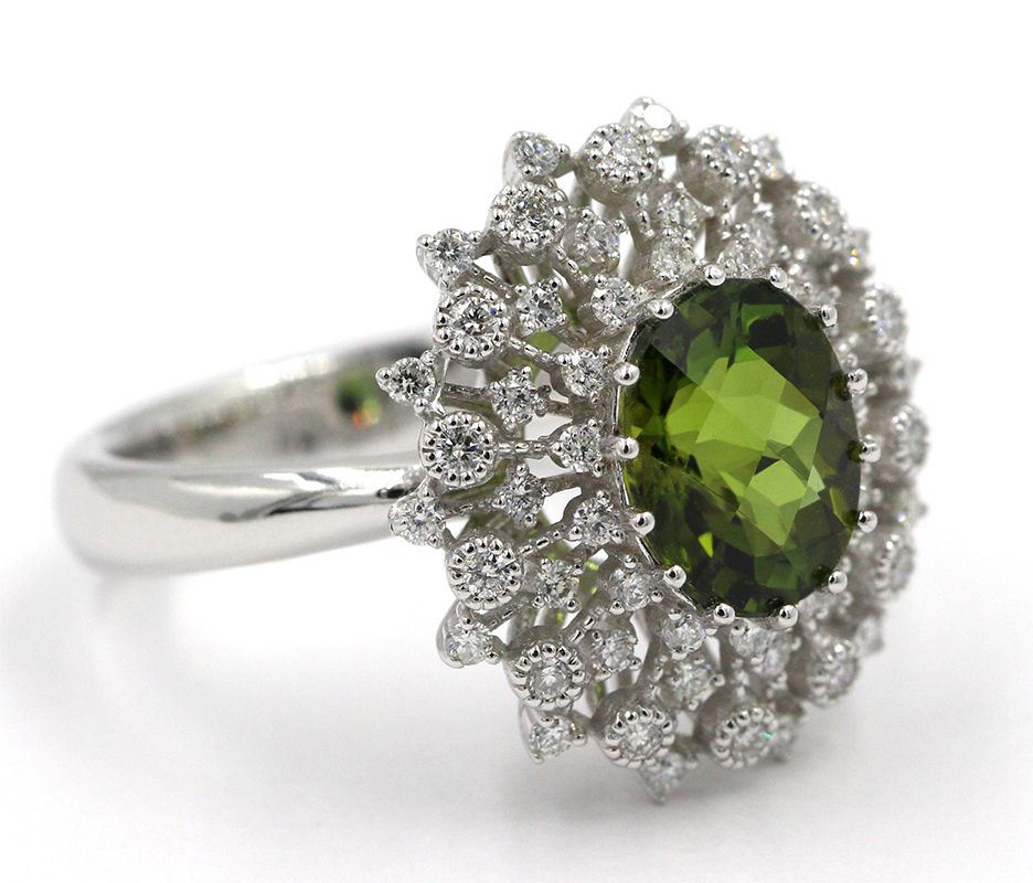 One Natural Oval Cut Green Tourmaline Anniversary Diamond Ring in 14k White Gold. Ring is size 6.5 but resizable. Total carat weight of ring is 2.71 Ct. Setting style is 4 prong with accent equating a total gross weight of 6.68 grams. Total stones is 57 and condition is brand new. Main stone is natural and non-enhanced, 2.20 Ct, oval shape, fine-bright clarity, and color is green tourmaline. Size approximation of main stone is 9.00 x 7.00 MM. Main stone cut is excellent. Side stone is natural and non-enhanced, total 0.51 carats, shape is brilliant round cut, clarity is SI1, color is G-H, cut is excellent, and has 56 stones. Included with independent certification with a retail value of $3,000.