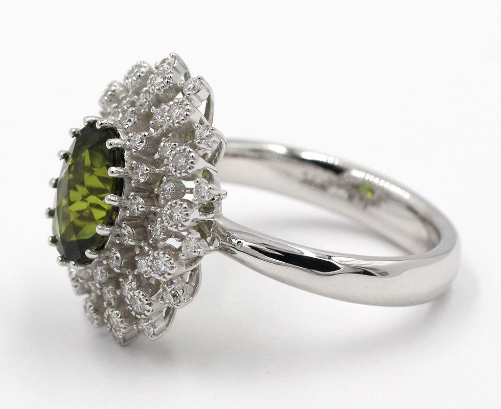 One Natural Oval Cut Green Tourmaline Anniversary Diamond Ring in 14k White Gold. Ring is size 6.5 but resizable. Total carat weight of ring is 2.71 Ct. Setting style is 4 prong with accent equating a total gross weight of 6.68 grams. Total stones is 57 and condition is brand new. Main stone is natural and non-enhanced, 2.20 Ct, oval shape, fine-bright clarity, and color is green tourmaline. Size approximation of main stone is 9.00 x 7.00 MM. Main stone cut is excellent. Side stone is natural and non-enhanced, total 0.51 carats, shape is brilliant round cut, clarity is SI1, color is G-H, cut is excellent, and has 56 stones. Included with independent certification with a retail value of $3,000.