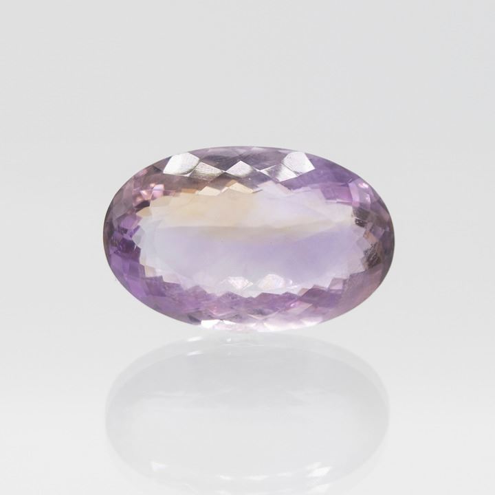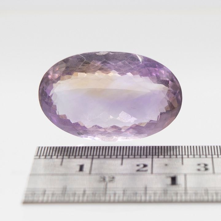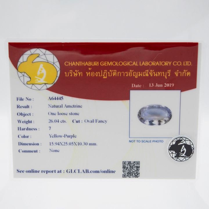 Certified unheated 26.04 Ct bi-color Bolivian ametrine. Rare to find this large of size in VVS1 condition. Near flawless. All-natural; no treatment. Nice fade from purple to golden hue. Fine oval cut measuring 15.94 x 25.05 x 10.30mm. Please see certification for further details.