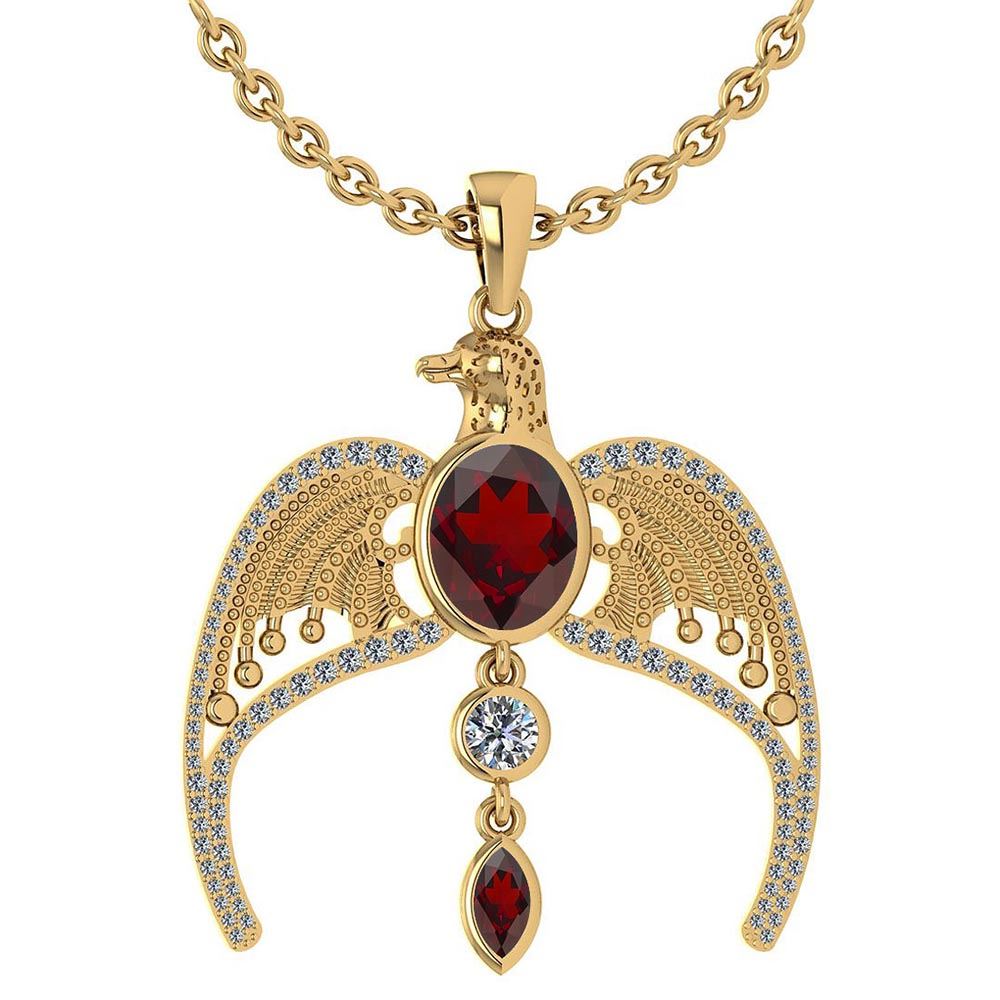 Certified 3.41 Ctw Garnet And Diamond Eagle Necklace Fo **|**|** Center Stone Approx Weight ; 2.50 Ctw (1 Pcs Oval )& 0.23 Ctw (1 Pcs Marquise) Stone Color: Garnet Stone Setting: Bezel Side Stone Weight: 0.23 Ctw (1 Pcs Round)And (100 Pcs Mini Round Cut Diamond)Ctw Weight Of 0.45 Ctw Diamond Stone Color: White G-H Diamond Stone Clarity: VS/SI1 Center Stone Setting ; Prong Metal Weight: Approx 6.61 Gram 14K Yellow Gold Eagle Necklace
