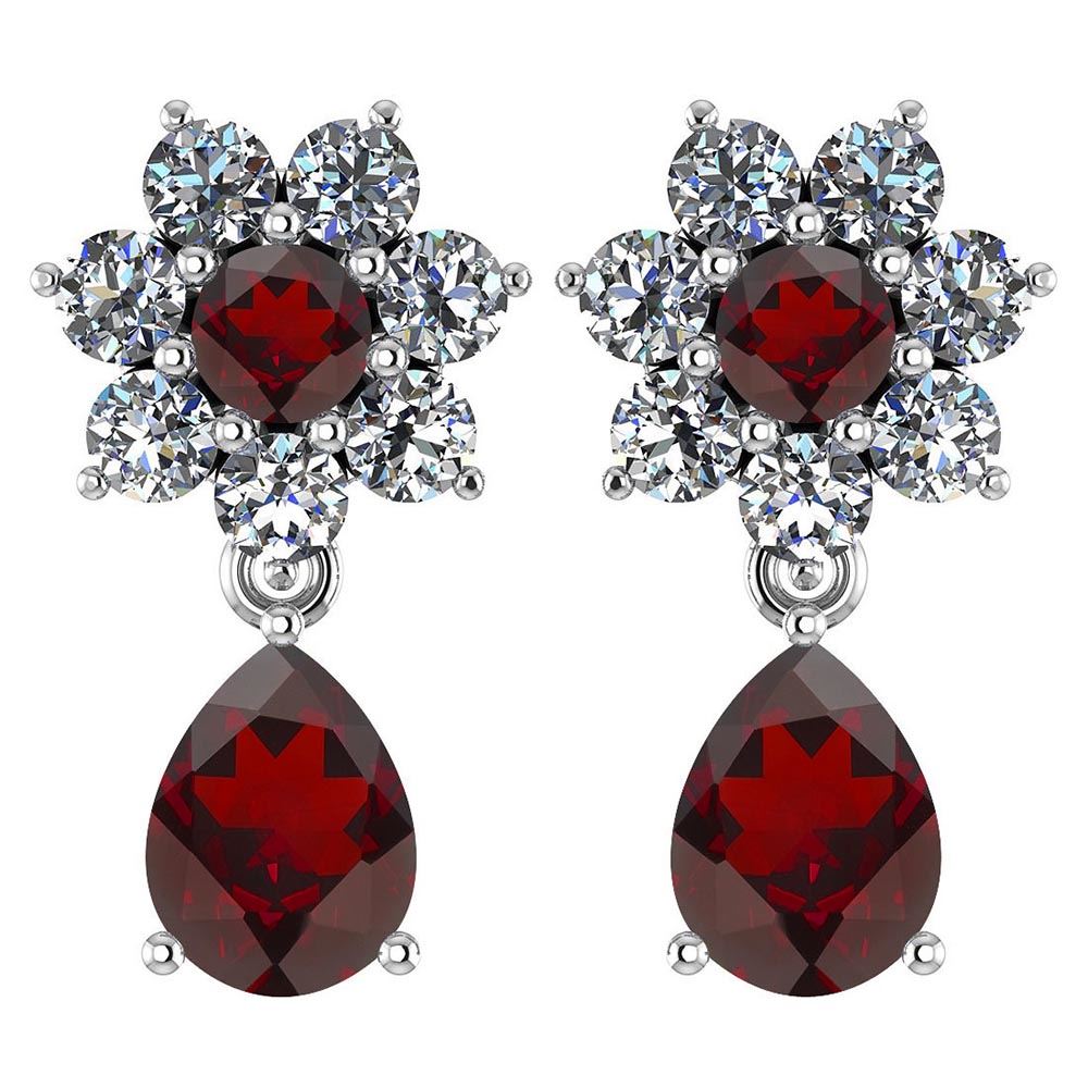 Certified 4.86 Ctw Garnet And Diamond 18K White Gold Ha **|**|** Center Stone Weight ; 3.00 Ctw (2 Psc Pear) Top Stone Weight : 0.46 (2 Pcs Round) Center Stone Color: Garnet Center Stone Setting ; Prong Side Stone (3.mm 14Pcs Round Cut Diamond) 1.40 ctw Side Stone Color: White G-H Diamond Side Stone Setting: Prong Side Stone Clarity : VS/SI1 Metal Color White Gold Metal Weight : Approx 3.94 Gram 18K White Gold Halo Dangling Earring