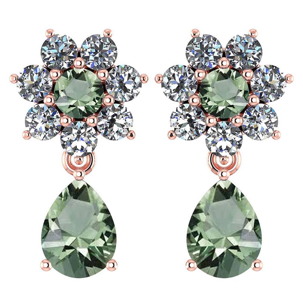 Certified 4.86 Ctw Green Amethyst And Diamond 18K Rose **|**|** Center Stone Weight ; 3.00 Ctw (2 Psc Pear) Top Stone Weight : 0.46 (2 Pcs Round) Center Stone Color: Green Amethyst Center Stone Setting ; Prong Side Stone (3.mm 14Pcs Round Cut Diamond) 1.40 ctw Side Stone Color: White G-H Diamond Side Stone Setting: Prong Side Stone Clarity : VS/SI1 Metal Color Rose Gold Metal Weight : Approx 3.94 Gram 18K Rose Gold Halo Dangling Earring
