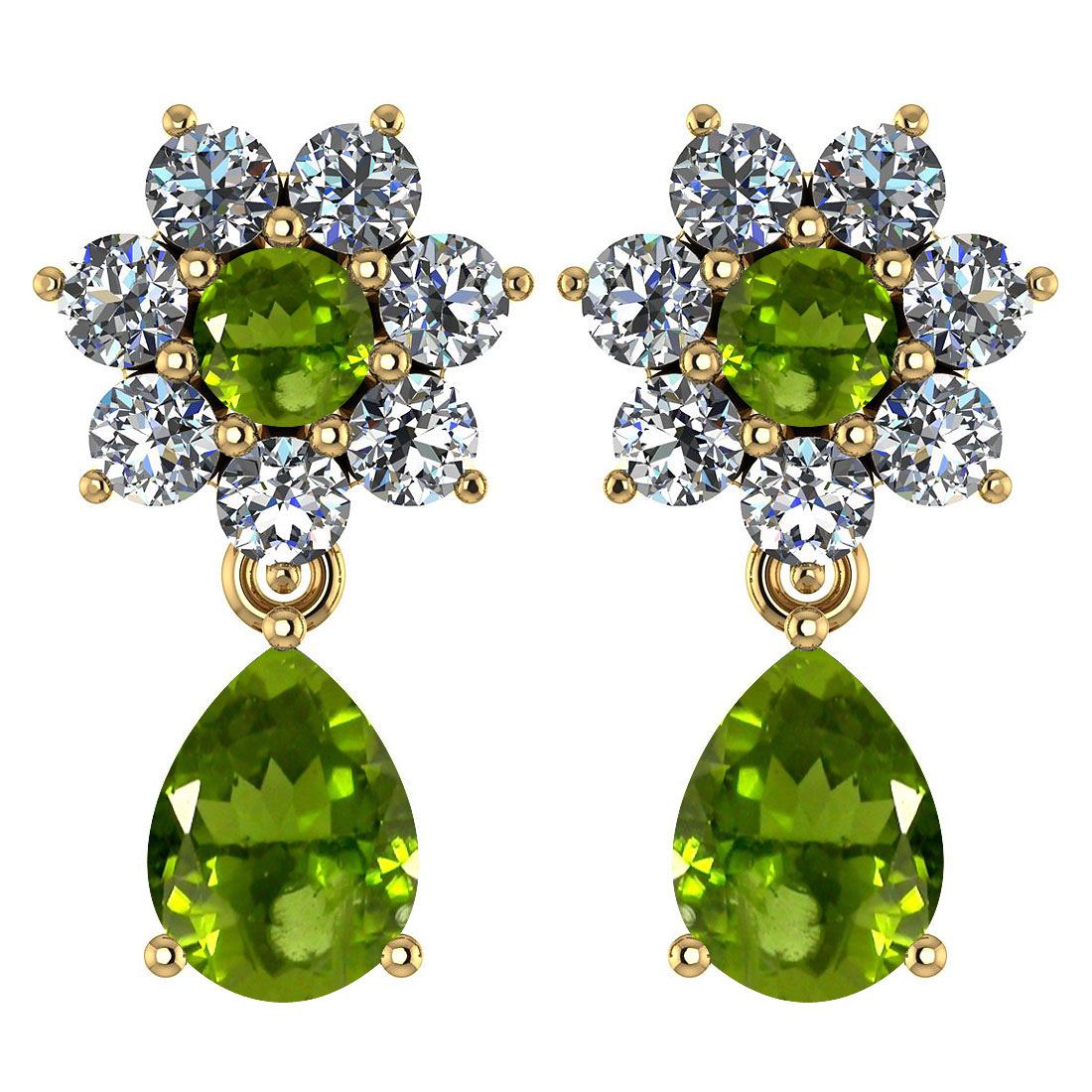 Certified 4.86 Ctw Peridot And Diamond 14k Yellow Gold **|**|** Center Stone Weight ; 3.00 Ctw (2 Pcs Pear) Top Stone Weight : 0.46 (2 Pcs Round) Center Stone Color: Peridot Center Stone Setting ; Prong Side Stone 1.40 ctw Side Stone Color: White J-K Diamond Side Stone Setting: Prong Side Stone Clarity: VS/SI1 Metal Color Yellow Gold Metal Weight : Approx 3.48 Gram 14K Yellow Gold Halo Dangling Earring