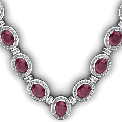 Certified 43.60 ctw Ruby& Diamond Necklace 14k **|**|** Mainstone: Ruby ; Metal Purity: 14kt ; Metal: W/Y Gold ; Diamond Count: 375 Round Cut ; Diamond CTW: 4.85 ; Diamond Clarity: SI ; Diamond Color: G-H ; Gem Count: 25 Oval Cut ; Gem CTW: 38.75 ; Gem Size(mm): 8x6mm; Gem Clarity: AA-AAA ; Approx Weight(g): 71; Availability: 3-10 Business days, ready to ship, with certification of appraisal will take 2 weeks. ; MSRP: $23000