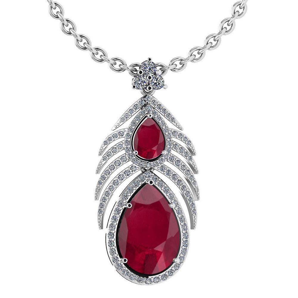 Certified 7.50 Ctw Ruby And Diamond Pear shape For wome **|**|** Center Stone Approx Weight ; 6.50 Ctw (2 Pcs Pear)Center Stone Color: Ruby Center Stone Setting : Prong Side Stone Weight: 0.74 Ctw (116 Pcs Round Cut Diamond) Side Stone Color: White G-H Diamond Stone Clarity: VS/SI1 Center Stone Setting ; Prong Metal Weight: Approx 5.60 Gram 14K White Gold Necklace