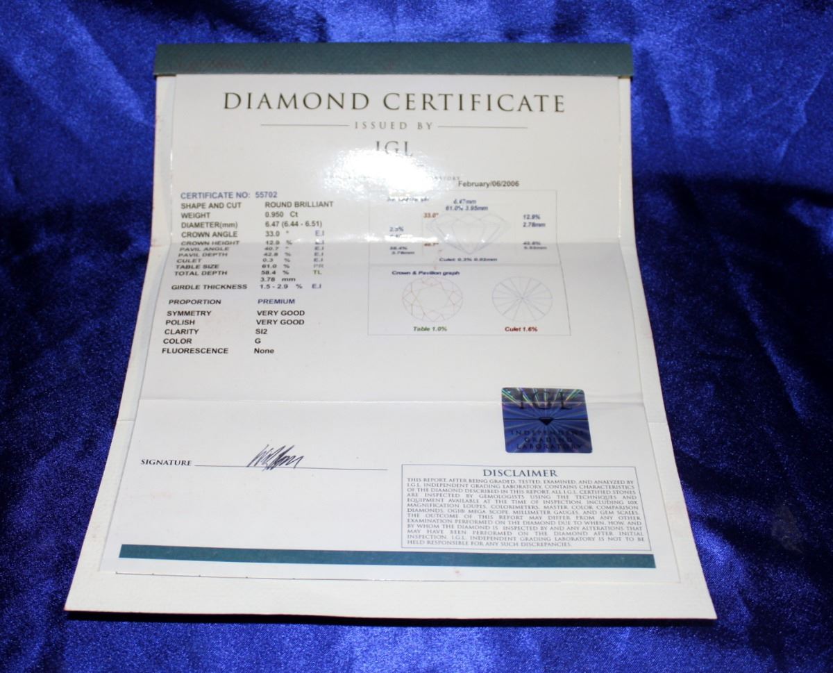 In 14K yellow gold, the diamond is high quality G color/SI clarity, very good cut, excellent proportion! Size 9 1/2 7.1g