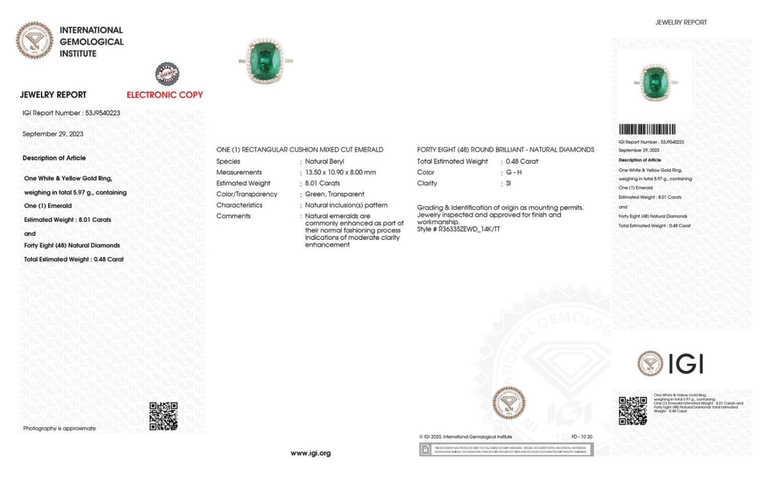 CERTIFICATION REPORT: The IGI Jewelry Report shown in the photos is included with this ring.