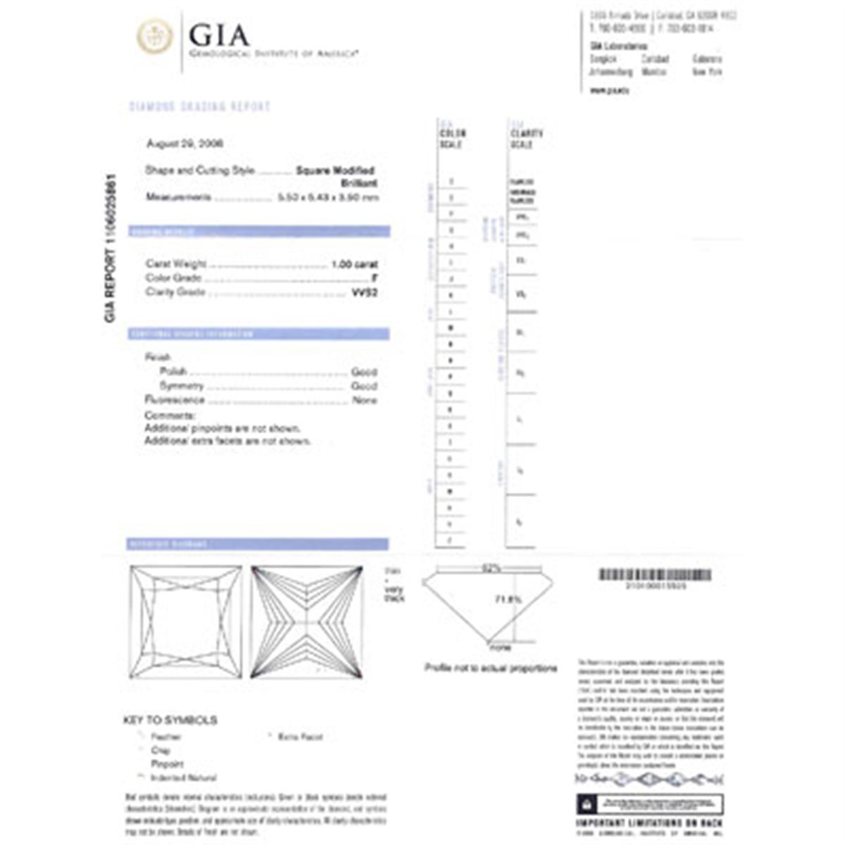 Certification: Certified GIA ; CTW: 1.00ctw ; Shape: Princees Cut ; Clarity: VVS2, Color: F ; MSRP: $19220
