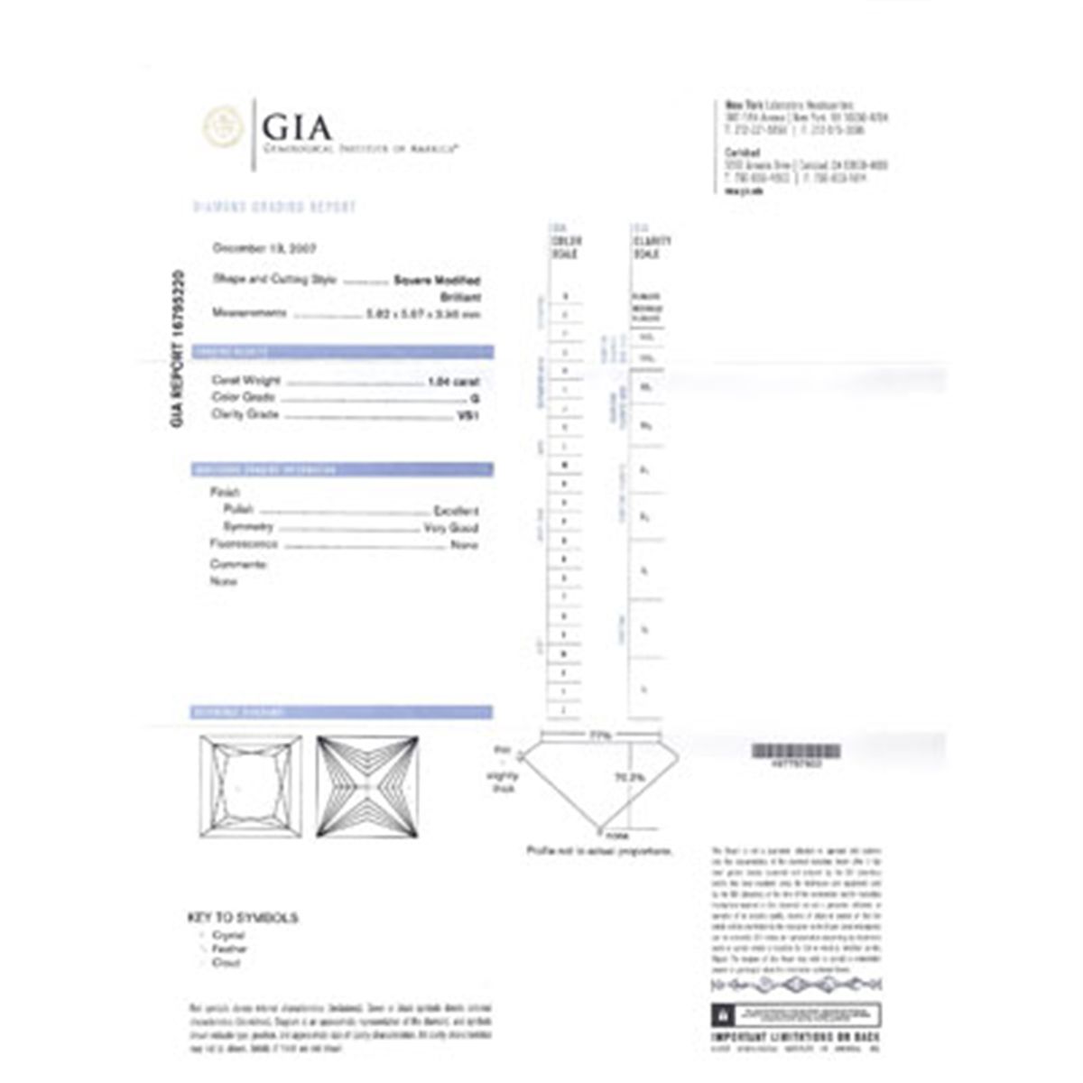 Certification: Certified GIA ; CTW: 1.04ctw ; Shape: Princess Cut ; Clarity: VS1 ; Color: G ; MSRP: $18376