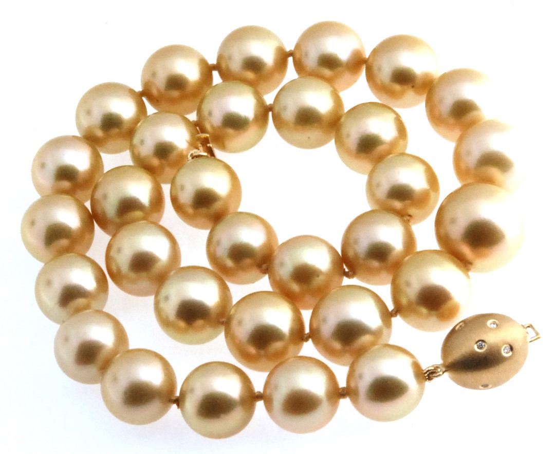 Fine Golden Pearl Strand Certified 14-12mm with 14K Gold Diamond Clasp