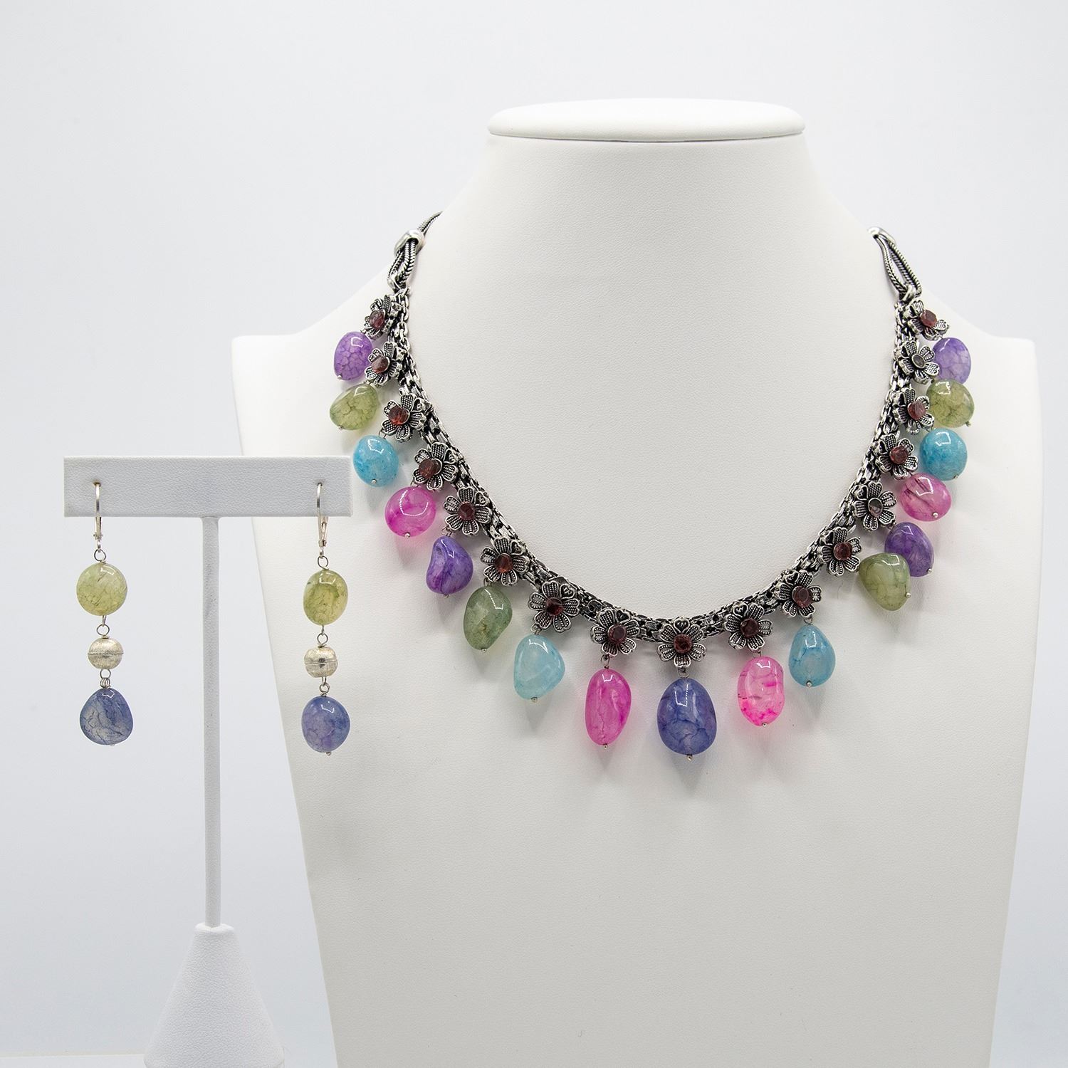 Beautiful Certified Multi Color Onyx Necklace And Earring Set.17 natural onyx stones adorn this necklace. The onyx stones are complimented by garnet accent stones. Mounted in .925 silver overlay. Approx. 18"long weighing 90 total grams or 450 Cttw. The average bead size is approx. 10 x 11 mm. A pair of multi color earrings are also included.