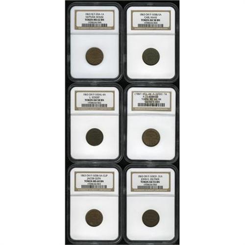 <B>Certified New Jersey-Ohio Civil War Store Card Lot.</B></I> Contains: an <B>1863 Neptune House, Atlantic City, NJ, Fuld-NJ-20A-1a, R.2, MS62 Brown NGC,</B></I> without the extensive obverse die breaks usually seen; <B>1863 L. Eckert, Cincinnati, OH, Fuld-OH-165AL-4a, R.5, AU58 NGC,</B></I> a few light reverse abrasions fail to detract from the appeal of this very scarce item; <B>1863 Jacob Guth, Cincinnati, OH, Fuld-OH-165BI-5a, R.5, MS60 Brown NGC,</B></I> on a rough planchet with some soiling, an edge clip, and a small obverse void, lustrous reverse--and scarce; <B>1863 Carl Haas, Cincinnati, OH, Fuld-OH-165BJ-5a, R.3, AU58 NGC,</B></I> pretty copper-jade patina; <B>(1861-65) H. Lazaress, Cincinnati, OH, Fuld-OH-165DC-1a, R.2, MS64 Brown,</B></I> some red remains on the porous planchet; and an <B>1863 John E. Zeltner, Cincinnati, OH, Fuld-OH-165GY-31a, R.2, AU55 NGC.</B></I> Current catalog value is about $275-$325.<BR><BR><b>Shipping:</b> Coin/Currency (<a target="_blank" href="http://www.heritageauctions.com/common/shipping.php">view shipping information</a>)