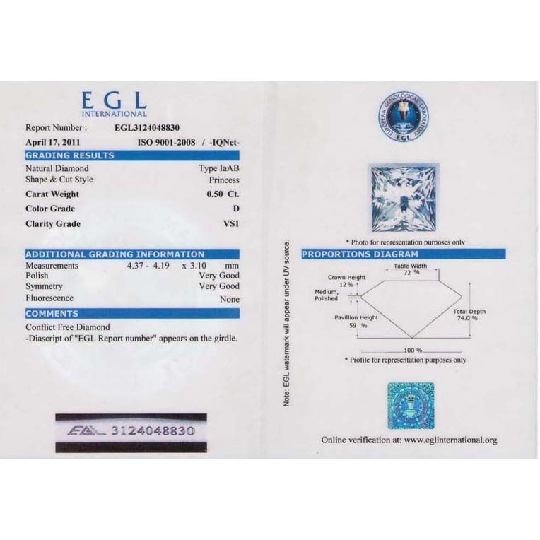 Certified Princess Diamond 0.50 Carat D, VS1 EGL ISRAEL **|**|** Shape: Princess; CTW: 0.5D ; Clarity: VS1 ; Certification: EGL ISRAEL ; Pol:VG ; Sym: VGN ; Meas: 4.37x4.19x3.10 ; Depth: 74 ; Table: 72 ; Girdle: MED ; MSRP: $1100