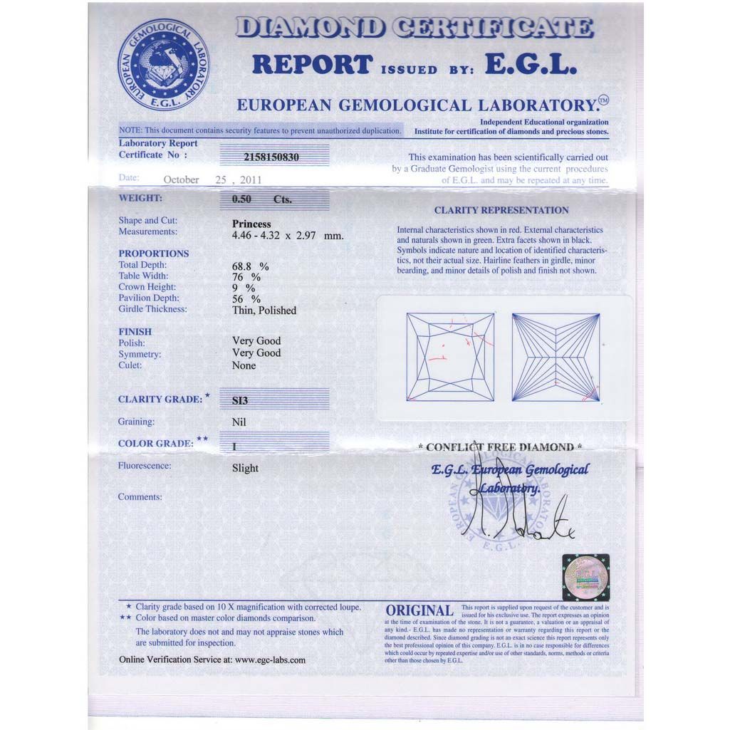 Certified Princess Diamond 0.50 Carat I, SI3 EGL ISRAEL **|**|** Shape: Princess; CTW: 0.5I ; Clarity: SI3 ; Certification: EGL ISRAEL ; Pol:VG ; Sym: VGF0 ; Meas: 4.46x4.32x2.97 ; Depth: 68.8 ; Table: 76 ; Comment: WHITE & EYECLEANISH ; MSRP: $2000