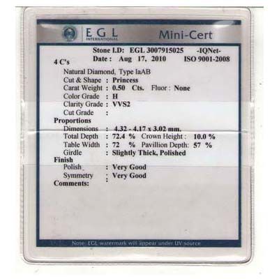 Certified Princess Diamond 0.50 Ct H, VVS2 EGL ISRAEL **|**|** Shape: Princess; CTW: 0.5H ; Clarity: VVS2 ; Certification: EGL ISRAEL ; Pol:VG ; Sym: VGN ; Meas: 4.32x4.17x3.02 ; Depth: 72.4 ; Table: 72 ; MSRP: $11100