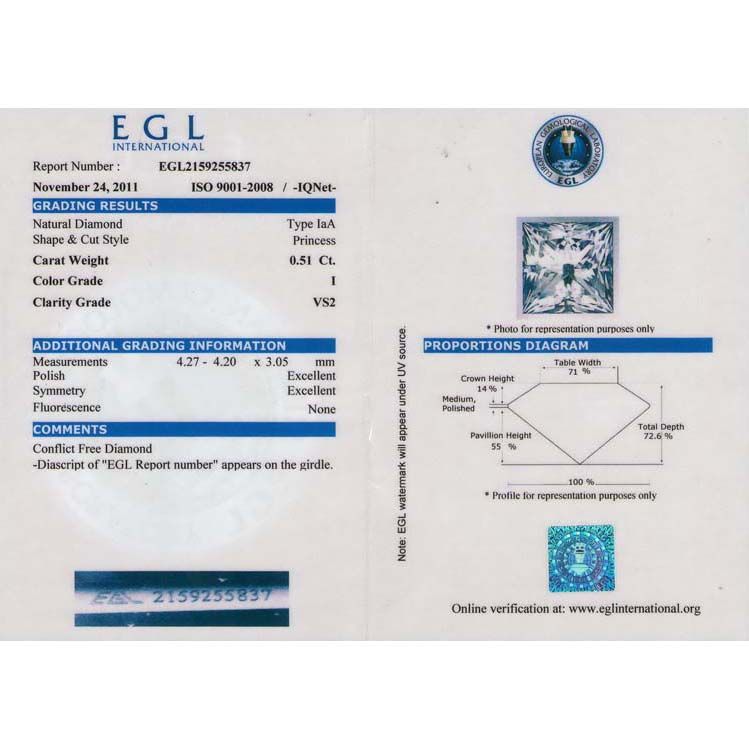 Certified Princess Diamond 0.51 Carat I, VS2 EGL ISRAEL **|**|** Shape: Princess; CTW: 0.51I ; Clarity: VS2 ; Certification: EGL ISRAEL ; Pol:X ; Sym: XN ; Meas: 4.27x4.20x3.05 ; Depth: 72.6 ; Table: 71 ; Girdle: MED ; MSRP: $8400