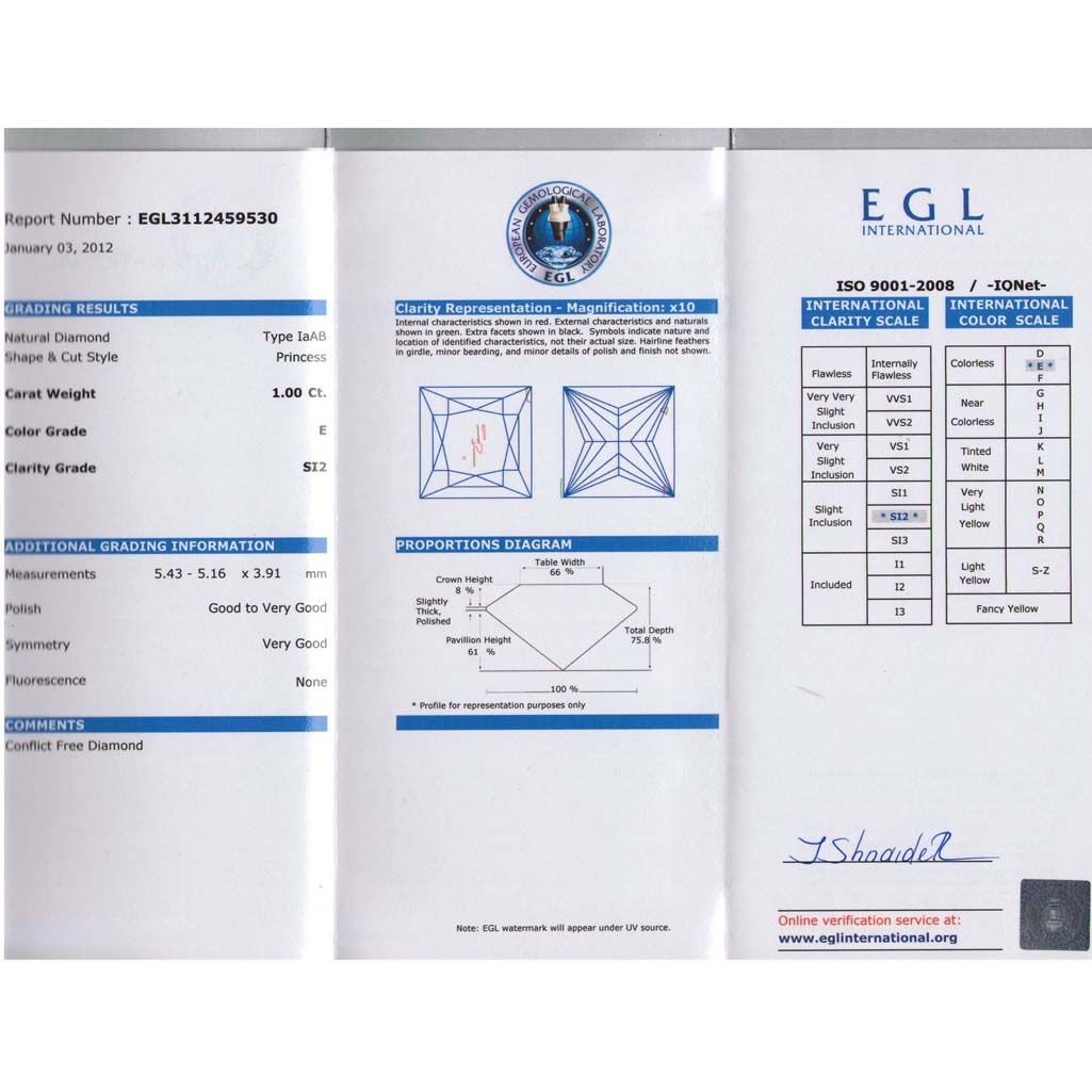 Certified Princess Diamond 1.00 Carat E, SI2 EGL ISRAEL **|**|** Shape: Princess; CTW: 1.00; Clarity: SI2 ; Certification: EGL ISRAEL ; Pol:VG ; Sym: VGN ; Meas: 5.43x5.16x3.91 ; Depth: 75.8 ; Table: 66 ; Girdle: SL THK ; Comment: EYECLEAN ; MSRP: $9800