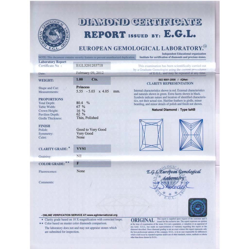 Certified Princess Diamond 1.00 Carat F, VVS1 EGL ISRAE **|**|** Shape: Princess; CTW: 1F ; Clarity: VVS1 ; Certification: EGL ISRAEL ; Pol:VG ; Sym: VGN ; Meas: 5.55x5.03x4.05 ; Depth: 80.4 ; Table: 67 ; Girdle: THN ; Comment: SUPER 0UY ; MSRP: $9700