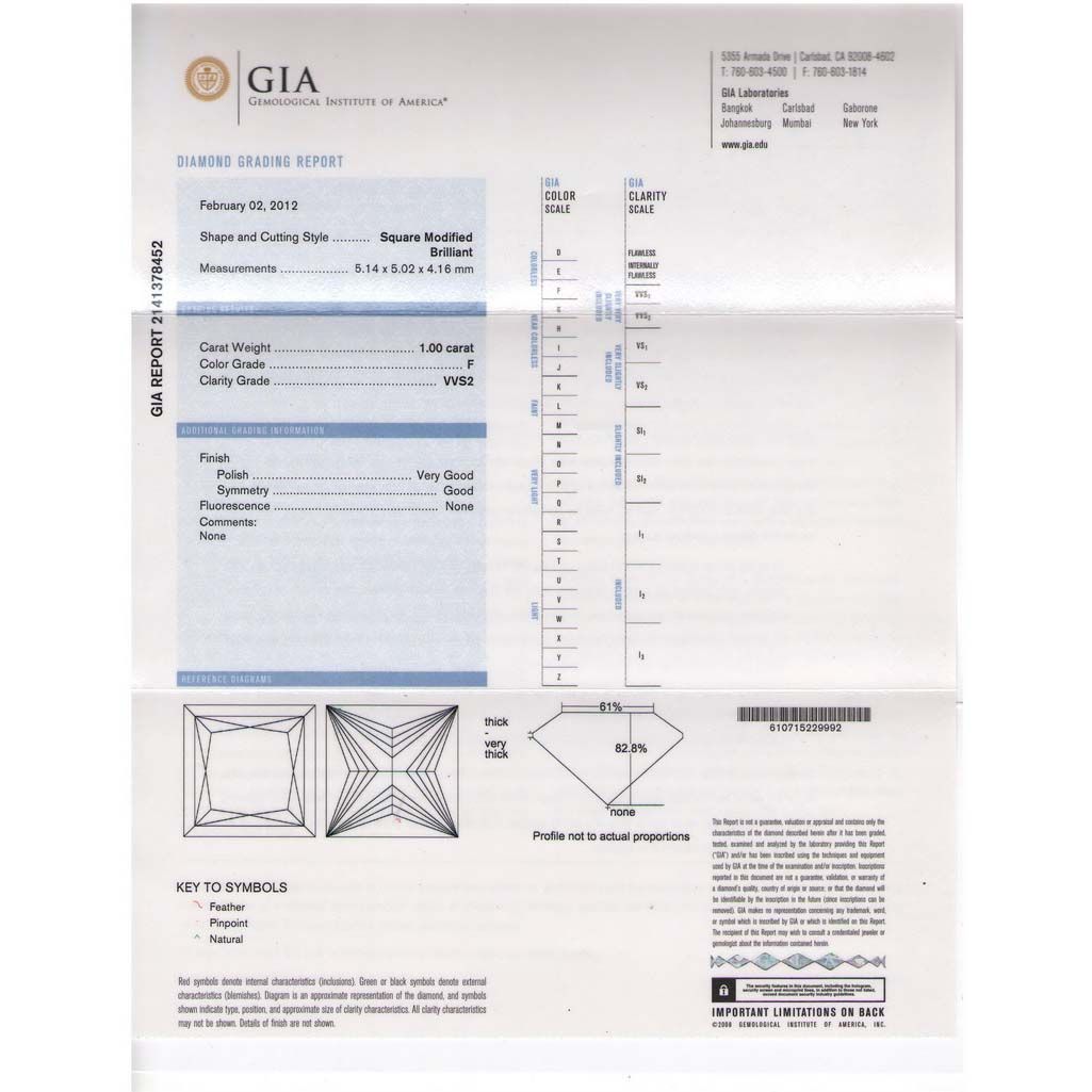 Certified Princess Diamond 1.00 Carat F, VVS2 GIA **|**|** Shape: Princess; CTW: 1F ; Clarity: VVS2 ; Certification: GIA ; Pol:VG ; Sym: GN ; Meas: 5.14x5.02x4.16 ; Depth: 82.8 ; Table: 61 ; Girdle: THK-V THK ; Comment: FULL OF LIFE ; MSRP: $45900