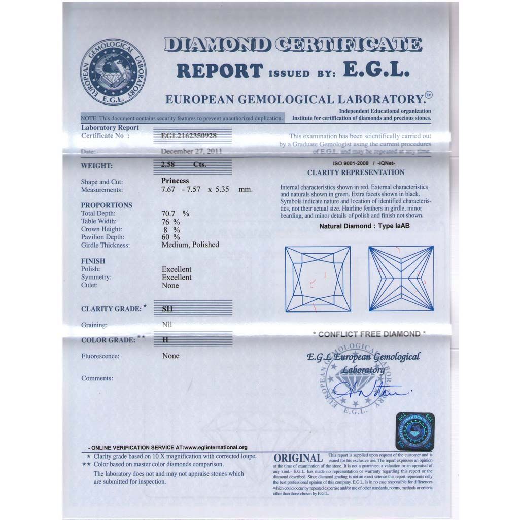 Certified Princess Diamond 2.58 Carat H, SI1 EGL ISRAEL **|**|** Shape: Princess; CTW: 2.58H ; Clarity: SI1 ; Certification: EGL ISRAEL ; Pol:X ; Sym: XN ; Meas: 7.67x7.57x5.35 ; Depth: 70.7 ; Table: 76 ; MSRP: $9800