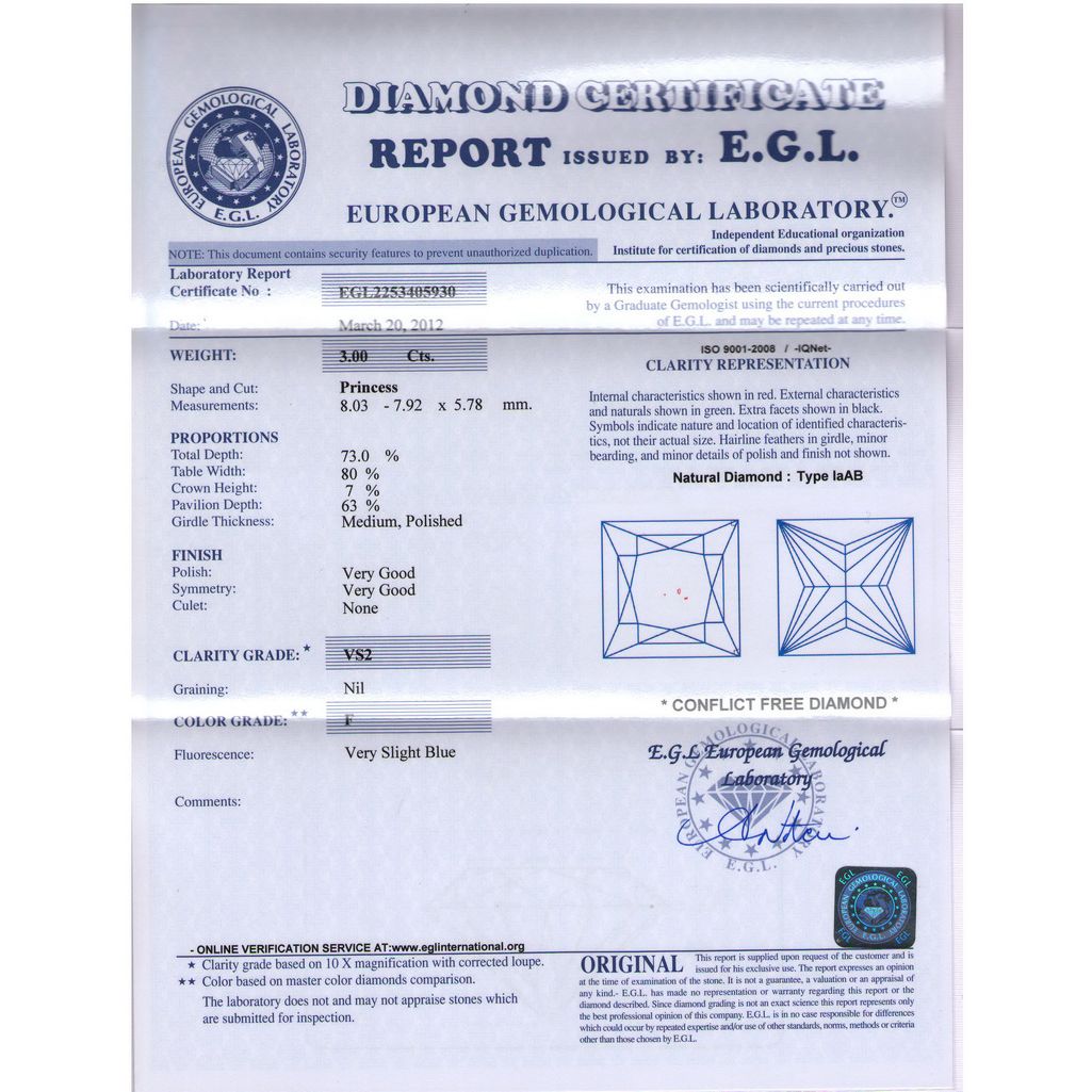 Certified Princess Diamond 3.0 Carat F, VS2 EGL ISRAEL **|**|** Shape: Princess; CTW: 3F ; Clarity: VS2 ; Certification: EGL ISRAEL ; Pol:VG ; Sym: VGF0 ; Meas: 8.03x7.92x5.78 ; Depth: 73 ; Table: 80 ; Girdle: MED ; MSRP: $29900