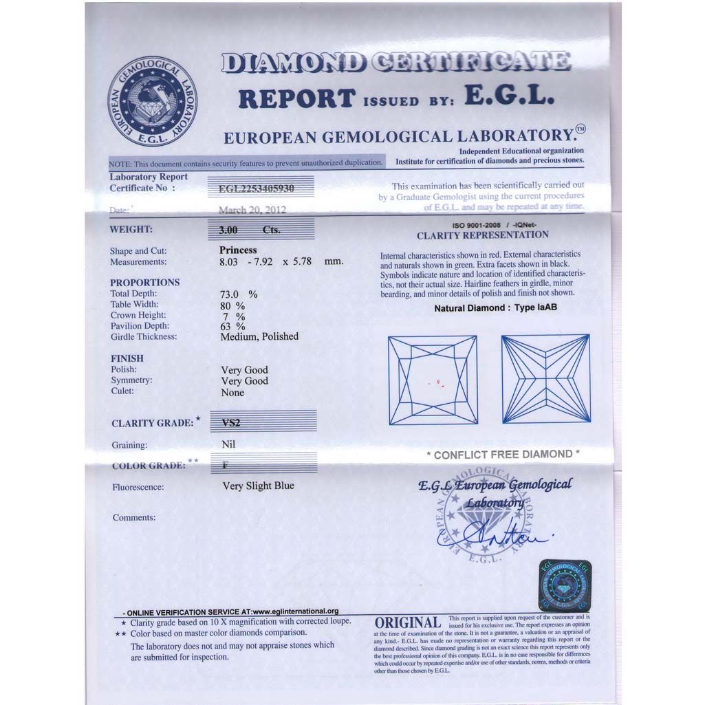 Certified Princess Diamond 3.00 Carat F, VS2 EGL ISRAEL **|**|** Shape: Princess; CTW: 3F ; Clarity: VS2 ; Certification: EGL ISRAEL ; Pol:VG ; Sym: VGF0 ; Meas: 8.03x7.92x5.78 ; Depth: 73 ; Table: 80 ; Girdle: MED ; MSRP: $29900