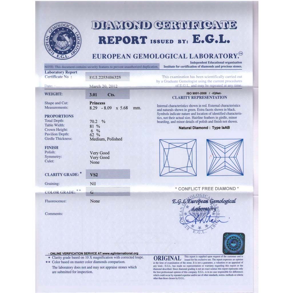 Certified Princess Diamond 3.01 Carat G, VS2 EGL ISRAEL **|**|** Shape: Princess; CTW: 3.01G ; Clarity: VS2 ; Certification: EGL ISRAEL ; Pol:VG ; Sym: VGN ; Meas: 8.29x8.09x5.68 ; Depth: 70.2 ; Table: 81 ; Girdle: MED ; Comment: SUPER 0UY ; MSRP: $26500