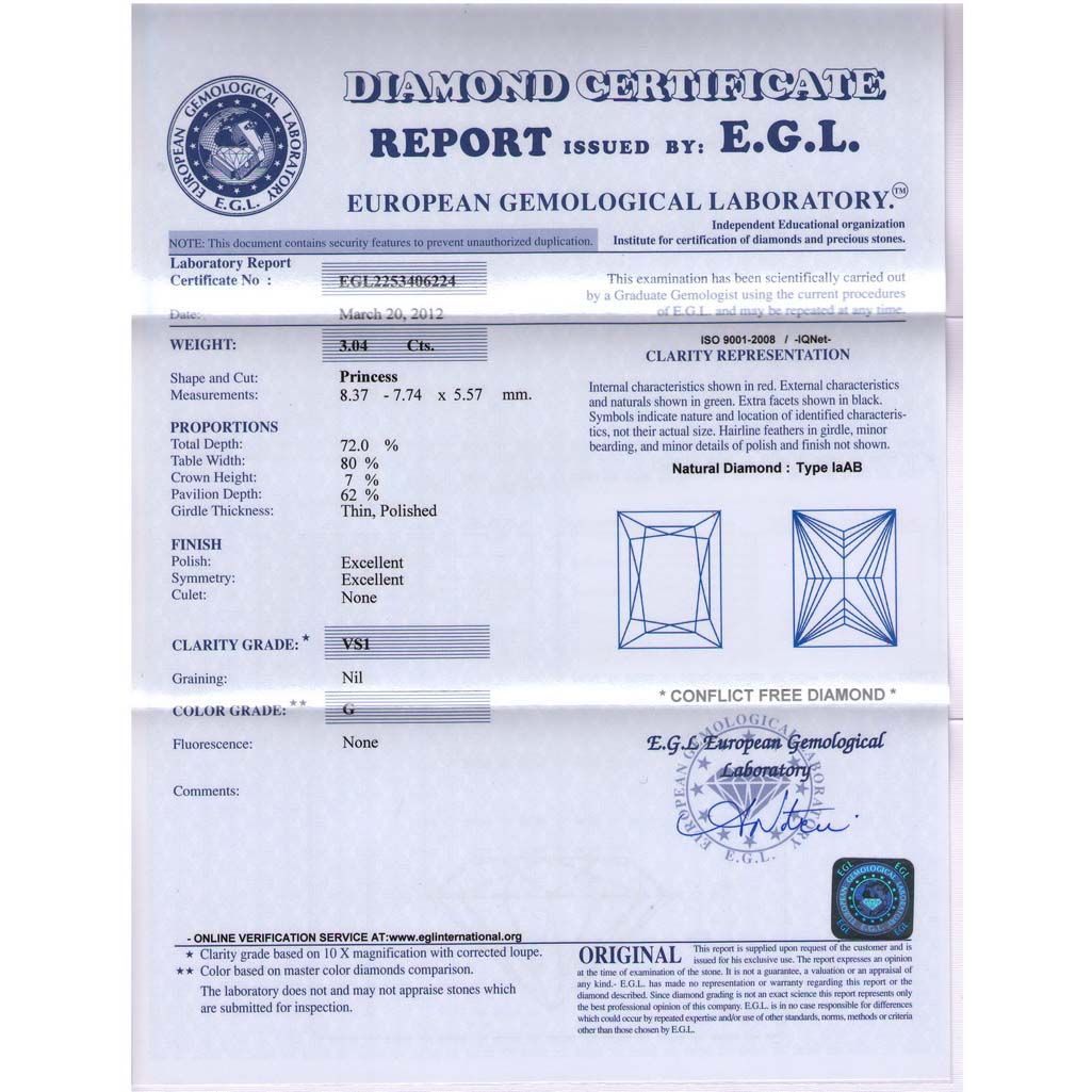 Certified Princess Diamond 3.04 Carat G, VS1 EGL ISRAEL **|**|** Shape: Princess; CTW: 3.04G ; Clarity: VS1 ; Certification: EGL ISRAEL ; Pol:X ; Sym: XN ; Meas: 8.37x7.74x5.57 ; Depth: 72 ; Table: 80 ; Girdle: THN ; Comment: SUPER 0UY ; MSRP: $23400