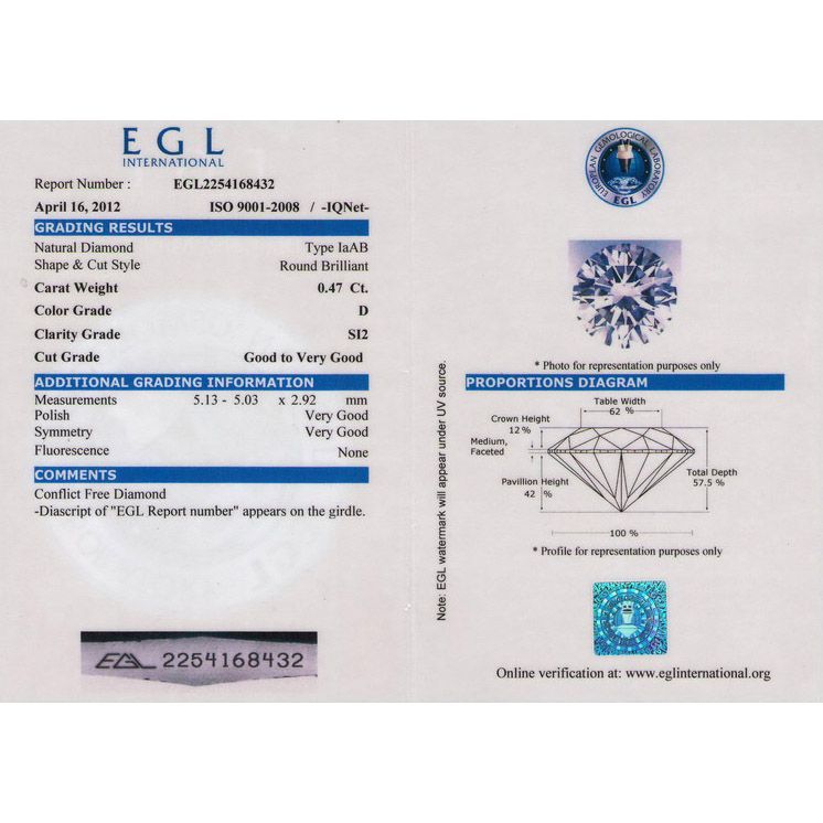 Certified Round Diamond 0.47ct, D,SI2, EGL ISRAEL **|**|** Shape: Round ; CTW: 0.47 ; Color: D ; Clarity: SI2 ; Certification: EGL ISRAEL ; Pol: ; Sym: VG ; Flour: ; Meas: 5.03-5.13x2.92 ; Depth: ; Table: 62 ; Girdle: MED ; Comment: EYECLEAN ; MSRP: $1700