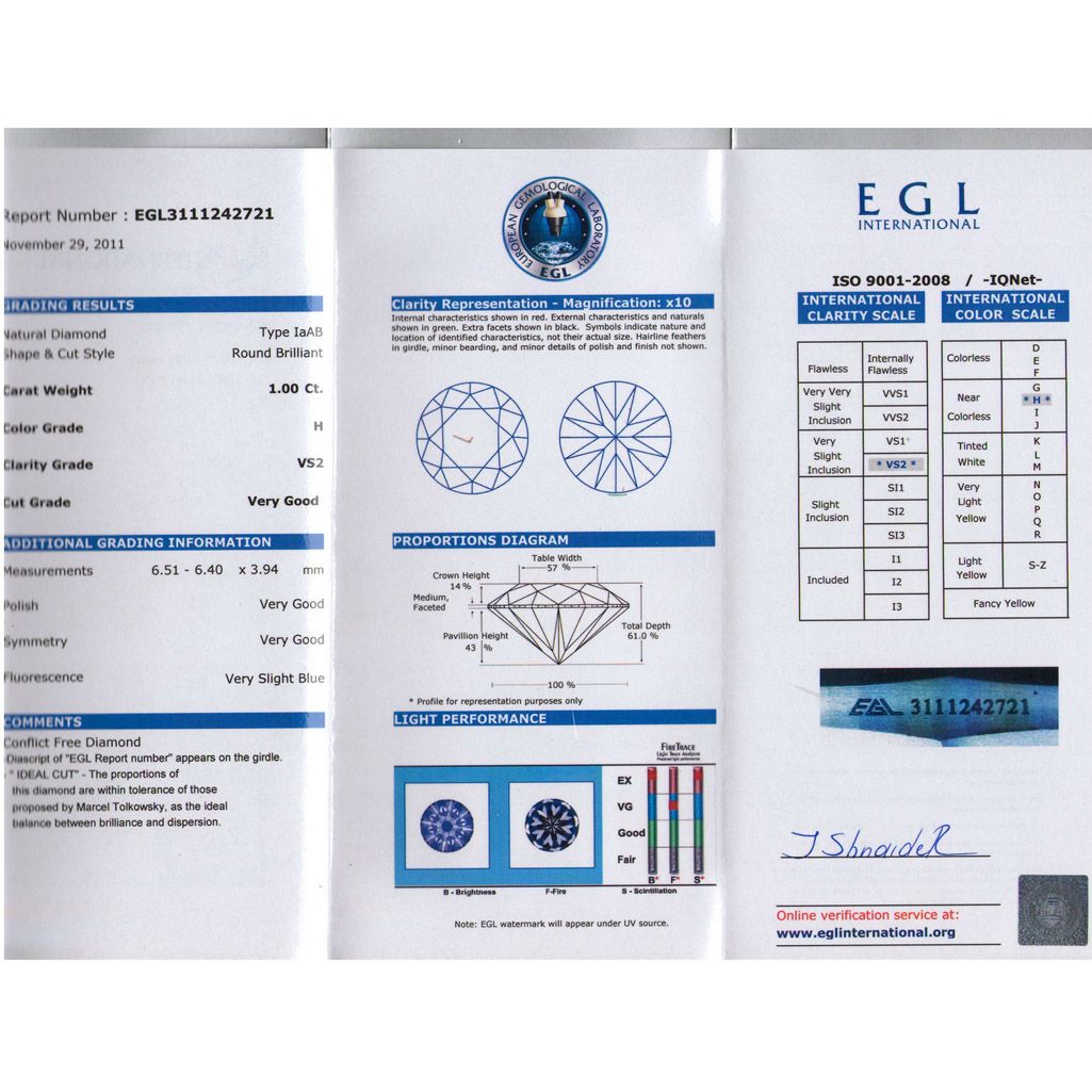 Certified Round Diamond 1.00ct, H, VS2, EGL ISRAEL **|**|** Shape: Round ; CTW: 1.00 ; Color: H ; Clarity: VS2 ; Certification: EGL ISRAEL ; Pol: ; Sym: VG ; Flour: ; Meas: 6.40-6.51x3.94 ; Depth: ; Table: 57 ; Girdle: MED ; Comment: TRIPLE VG ; MSRP: $13300
