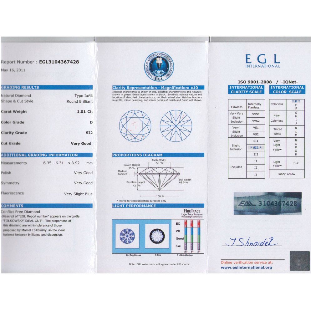 Certified Round Diamond 1.01ct, D, SI2, EGL ISRAEL **|**|** Shape: Round ; CTW: 1.01 ; Color: D ; Clarity: SI2 ; Certification: EGL ISRAEL ; Pol: ; Sym: VG ; Flour: ; Meas: 6.31-6.35x3.92 ; Depth: ; Table: 58 ; Girdle: MED ; Comment: EYECLEANISH, TOLKOWSKY IDEAL CUT ; MSRP: $10200