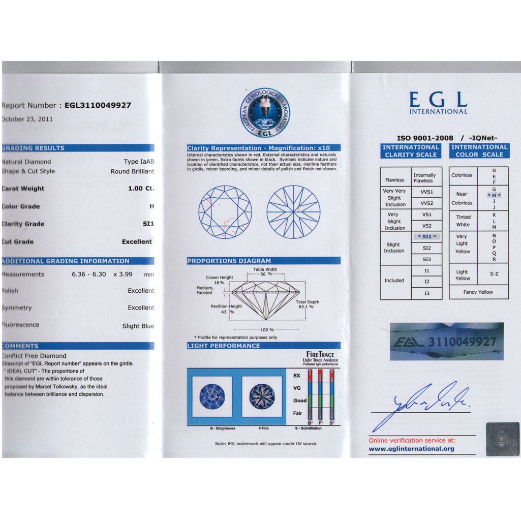 Certified Round Diamond 1.0ct, H, SI1, EGL ISRAEL **|**|** Shape: Round ; CTW: 1 ; Color: H ; Clarity: SI1 ; Certification: EGL ISRAEL ; Pol: ; Sym: X ; Flour: ; Meas: 6.30-6.36x3.99 ; Depth: ; Table: 56 ; Girdle: MED ; Comment: TRIPLE EX ; MSRP: $11100