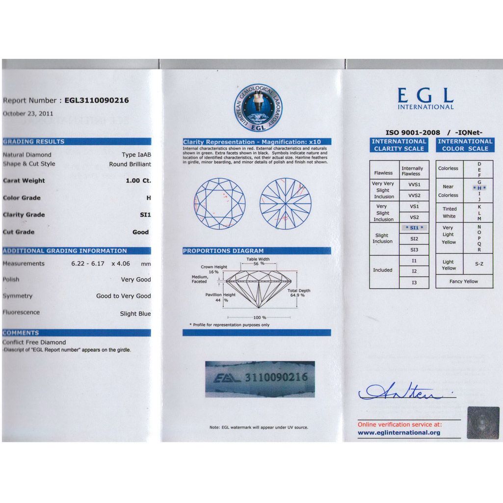 Certified Round Diamond 1.0ct, H, SI1, EGL ISRAEL **|**|** Shape: Round ; CTW: 1 ; Color: H ; Clarity: SI1 ; Certification: EGL ISRAEL ; Pol: ; Sym: VG ; Flour: ; Meas: 6.17-6.22x4.06 ; Depth: ; Table: 56 ; Girdle: MED ; Comment: 0ALL OF FIRE ; MSRP: $9600