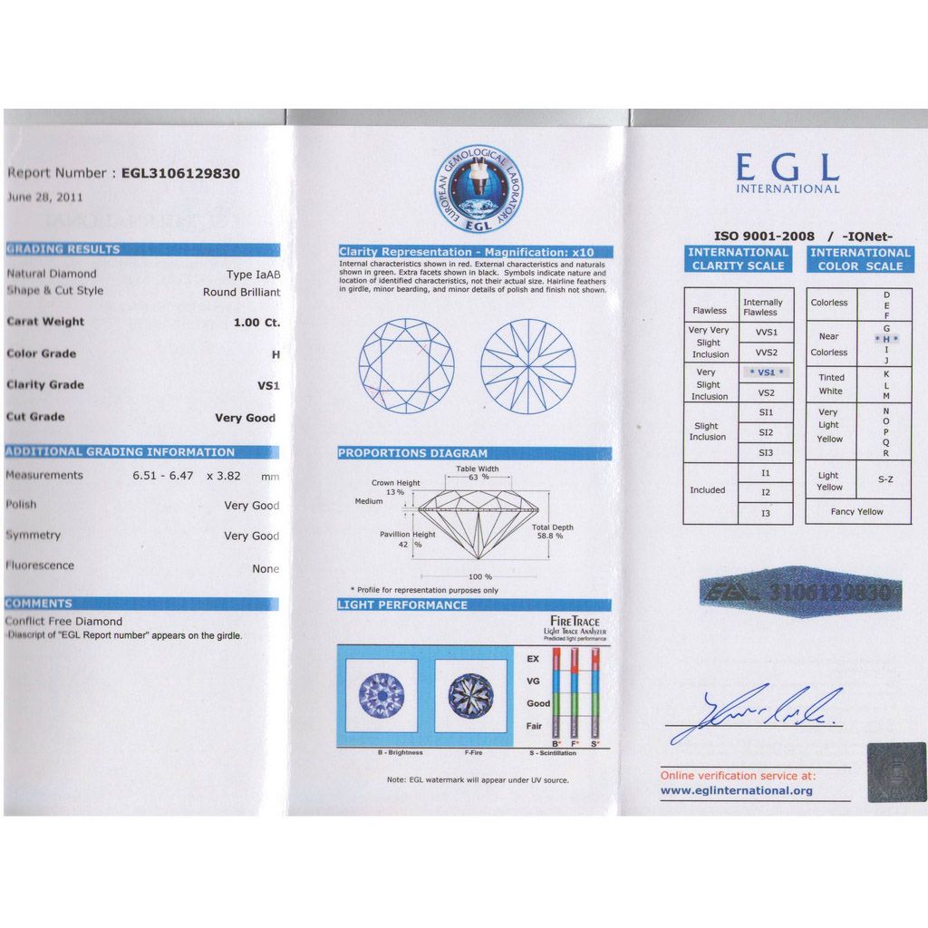 Certified Round Diamond 1.0ct, H, VS1, EGL ISRAEL **|**|** Shape: Round ; CTW: 1 ; Color: H ; Clarity: VS1 ; Certification: EGL ISRAEL ; Pol: ; Sym: VG ; Flour: ; Meas: 6.47-6.51x3.82 ; Depth: ; Table: 63 ; Girdle: MED ; MSRP: $14700