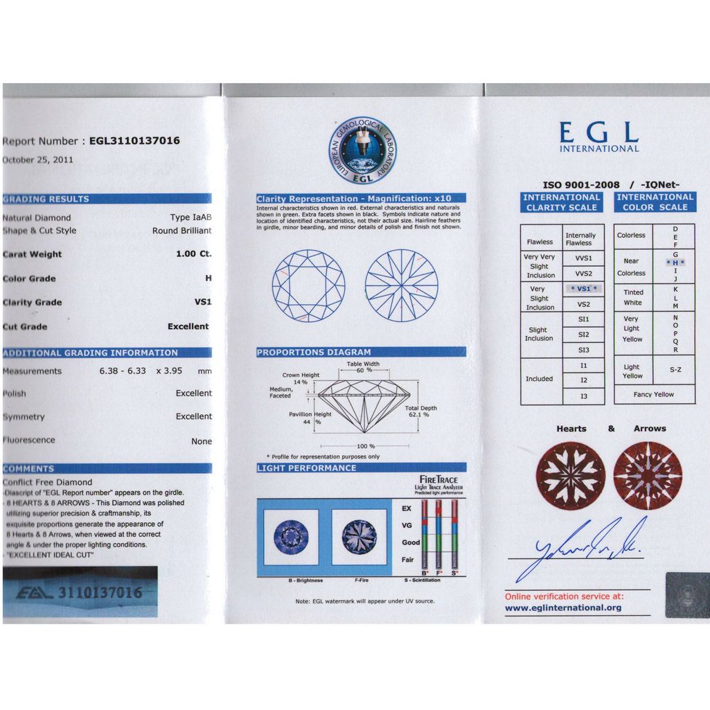 Certified Round Diamond 1.0ct, H,VS1, EGL ISRAEL **|**|** Shape: Round ; CTW: 1 ; Color: H ; Clarity: VS1 ; Certification: EGL ISRAEL ; Pol: ; Sym: X ; Flour: ; Meas: 6.33-6.38x3.95 ; Depth: ; Table: 60 ; Girdle: MED ; Comment: TRIPLE EXCELLENT ; MSRP: $14700