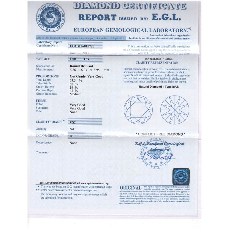 Certified Round Diamond 1.0ct, H, VS2, EGL ISRAEL **|**|** Shape: Round ; CTW: 1 ; Color: H ; Clarity: VS2 ; Certification: EGL ISRAEL ; Sym: VG ; Flour: ; Meas: 6.23-6.26x3.95 ; Depth: ; Table: 62 ; Girdle: MED ; MSRP: $12900