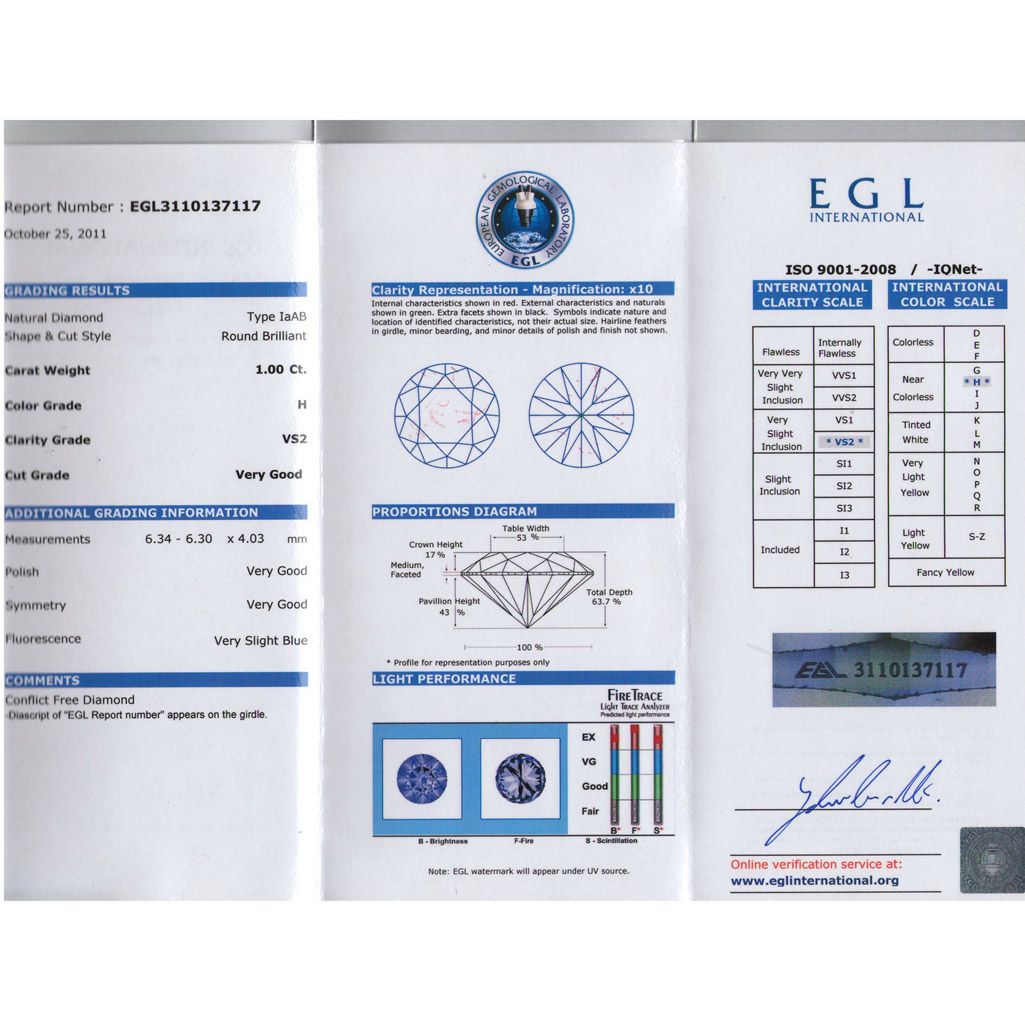 Certified Round Diamond 1.0ct, H, VS2, EGL ISRAEL **|**|** Shape: Round ; CTW: 1 ; Color: H ; Clarity: VS2 ; Certification: EGL ISRAEL ; Pol: ; Sym: VG ; Flour: ; Meas: 6.30-6.34x4.03 ; Depth: ; Table: 53 ; Girdle: MED ; MSRP: $11900