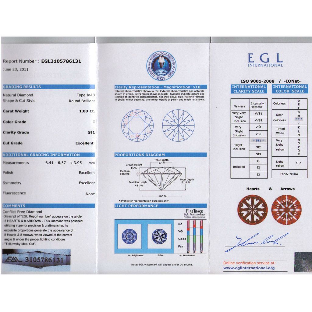 Certified Round Diamond 1.0ct, I, SI1, EGL ISRAEL **|**|** Shape: Round ; CTW: 1 ; Color: I ; Clarity: SI1 ; Certification: EGL ISRAEL ; Pol: ; Sym: X ; Flour: ; Meas: 6.37-6.41x3.95 ; Depth: ; Table: 57 ; Girdle: MED ; Comment: TOLKOWSKY IDEAL CUT ; MSRP: $8500