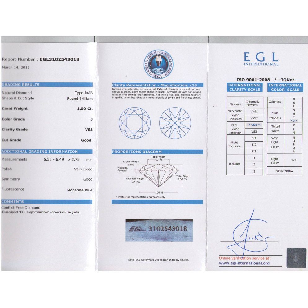 Certified Round Diamond 1.0ct, J, VS1, EGL ISRAEL **|**|** Shape: Round ; CTW: 1 ; Color: J ; Clarity: VS1 ; Certification: EGL ISRAEL ; Pol: ; Sym: VG ; Flour: ; Meas: 6.49-6.55x3.75 ; Depth: ; Table: 60 ; Girdle: MED ; Comment: SUPER 0UY ; MSRP: $8600