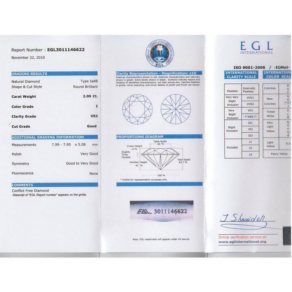 Certified Round Diamond 2.0 ct, I, VS2, EGL ISRAEL **|**|** Shape: Round ; CTW: 2 ; Color: I ; Clarity: VS2 ; Certification: EGL ISRAEL ; Sym: VG ; Flour: ; Meas: 7.95-7.99x5.08 ; Depth: ; Table: 50 ; Comment: WHITE, WHITE,WHITE... ; MSRP: $33500